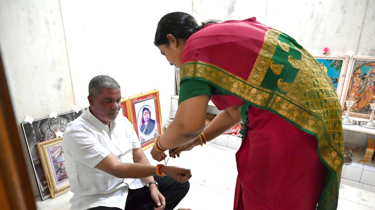 ಸಹೋದರಿ ಲಕ್ಷ್ಮೀ ಅವರು ಬಾಲಚಂದ್ರ ಜಾರಕಿಹೊಳಿ ಅವರಿಗೆ ಹಣೆಗೆ ತಿಲಕವನ್ನಿಟ್ಟು ಆರತಿಯನ್ನು ಬೆಳಗಿ ರಾಖಿಯನ್ನು ಕಟ್ಟುವ ಮೂಲಕ ರಕ್ಷಾ ಬಂಧನ ಹಬ್ಬದ ಶುಭಾಶಯ ತಿಳಿಸಿದರು. ಈ ಸಂದರ್ಭದಲ್ಲಿ ಲಕ್ಷ್ಮೀ ನಾಯಕ ಅವರ ಪುತ್ರ ಅಭಿಷೇಕ ಮತ್ತು ಪುತ್ರಿ ಅರುಣಾ ಉಪಸ್ಥಿತರಿದ್ದರು.ಕೋಟ್..ಪ್ರತಿಯೊಬ್ಬ ಸಹೋದರಿಯರು ಸಮಾಜದ ದುಷ್ಟಶಕ್ತಿಗಳಿಂದ ರಕ್ಷಿಸಲೆಂದು ತಮ್ಮ ಸಹೋದರರಿಗೆ ರಾಖಿ ಕಟ್ಟುತ್ತಾರೆ. ಪ್ರತಿಯಾಗಿ ಸಹೋದರರು ಕೂಡ ತಮ್ಮ ಭಾತೃತ್ವ ಪ್ರೀತಿಯನ್ನು ಉಜ್ವಲಗೊಳಿಸಲು ಸಹೋದರಿಯರಿಗೆ ಬೆನ್ನೆಲುಬು ನಿಲ್ಲುತ್ತಾರೆ. ಪ್ರಾಚೀನ ಕಾಲದಿಂದಲೂ ಶ್ರಾವಣ ಮಾಸದಲ್ಲಿ ಆಚರಿಸುವ ರಕ್ಷಾ ಬಂಧನವು ಒಡಹುಟ್ಟಿದವರ ನಡುವಿನ ವಾತ್ಸಲ್ಯವನ್ನು ಬಿಂಬಿಸುವ ಹಬ್ಬವೇ ಈ ರಕ್ಷಾ ಬಂಧನವಾಗಿದೆ.-ಬಾಲಚಂದ್ರ ಜಾರಕಿಹೊಳಿ, ಅರಬಾವಿ ಶಾಸಕ ಮತ್ತು ಬೆಮ್ಯುಲ್ ಅಧ್ಯಕ್ಷರು.