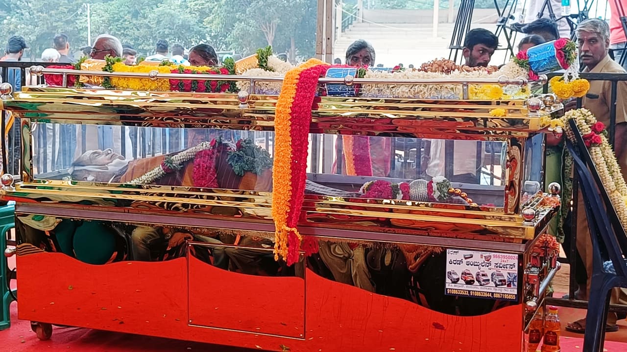 ಸಾರ್ವಜನಿಕರ ದರ್ಶನ:ನೆಲಮಂಗಲ ಪಟ್ಟಣದ ಅಂಬೇಡ್ಕರ್ ಕ್ರೀಡಾಂಗಣದಲ್ಲಿ ಶನಿವಾರ ಮುಂಜಾನೆ 5.45 ಗಂಟೆಗೆ ಸಾರ್ವಜನಿಕರ ದರ್ಶನಕ್ಕೆ ವ್ಯವಸ್ಥೆ ಮಾಡಲಾಗಿತ್ತು. ನಂತರ 10.15ಕ್ಕೆ ರವೀಂದ್ರ ಕಲಾಕ್ಷೇತ್ರಕ್ಕೆ ತರಲಾಯಿತು.