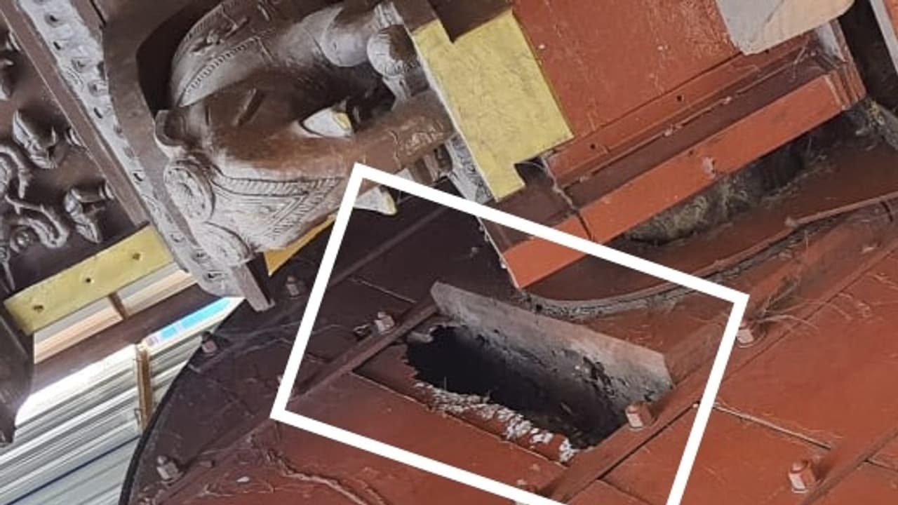 ಹೊಳೆನರಸೀಪುರ ಪಟ್ಟಣದ ಐತಿಹಾಸಿಕ ಶ್ರೀ ಲಕ್ಷ್ಮೀನರಸಿಂಹಸ್ವಾಮಿ ದೇವಾಲಯದ ರಥದ ಚಕ್ರವನ್ನು ಗೆದ್ದಲು ತಿಂದಿರುವುದು.
