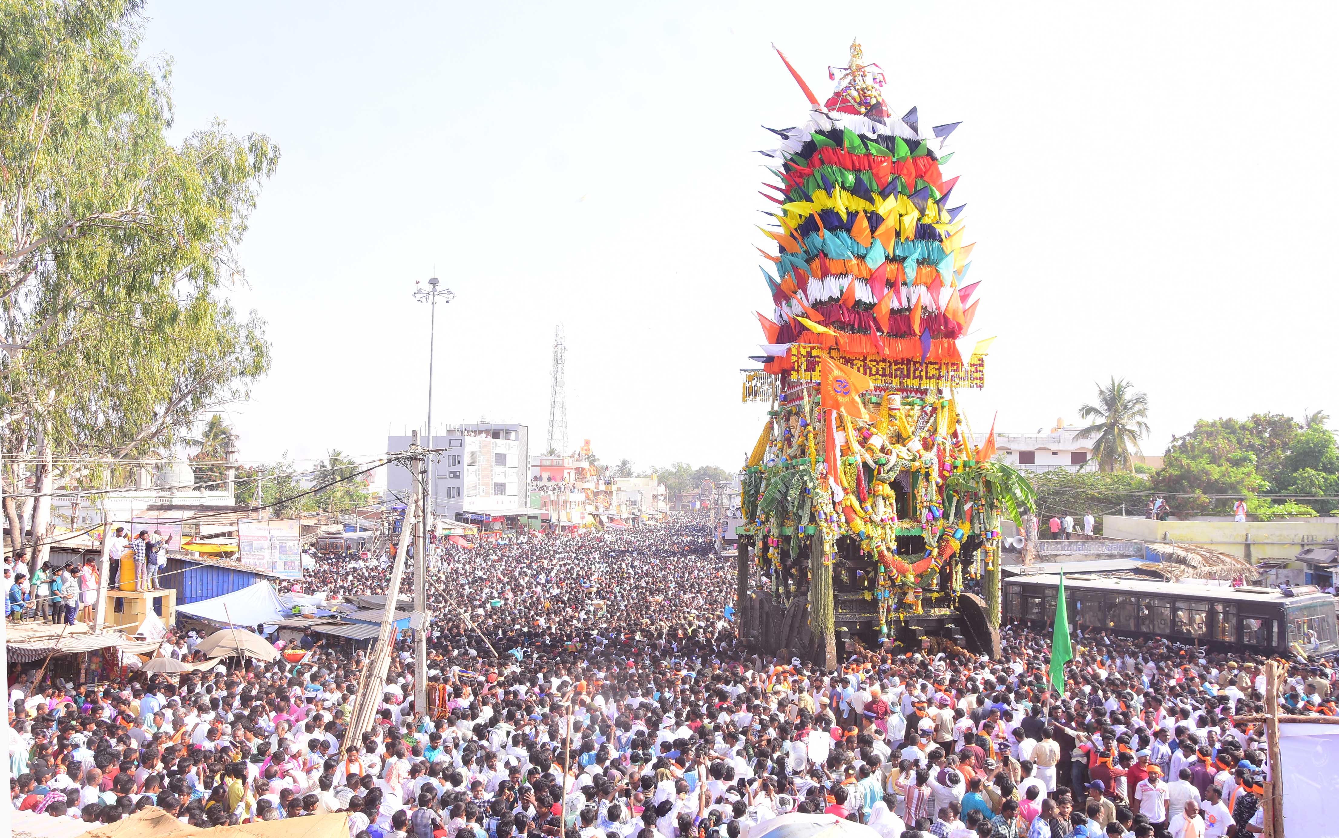 *ಲಕ್ಷಾಂತರ ಭಕ್ತರ ದಂಡು: ಕೊಪ್ಪಳದ ಗವಿಸಿದ್ದೇಶ್ವರನ ತೇರಿಗೆ ಏಳರಿಂದ ಎಂಟು ಲಕ್ಷ ಭಕ್ತರು ಪಾಲ್ಗೊಂಡರೆ, ನಾಯಕನಹಟ್ಟಿ ರಥೋತ್ಸವಕ್ಕೆ ಬರೋಬ್ಬರಿ ನಾಲ್ಕು ಲಕ್ಷ ಜನಸಂಖ್ಯೆ ಸೇರುತ್ತದೆ ಎಂದೇ ಹೆಸರಾಗಿದೆ. ಮೂಲ ಸ್ಥಳದಿಂದ ಪಾದಗಟ್ಟೆವರೆಗೆ ಸಾಗಿ ಹೋಗುವ ರಥೋತ್ಸವಕ್ಕೆ ರಾಜ್ಯದ ನಾನಾ ಭಾಗಗಳಿಂದ ಬಂದ ಭಕ್ತ ಸಮೂಹ ಮುಗಿಲು ಮುಟ್ಟುವ ಹರ್ಷೋದ್ಗಾರಗಳಿಂದ ರಥವನ್ನು ಎಳೆಯುವುದನ್ನು ನೋಡುವುದೇ ಒಂದು ರೋಚಕ ಸನ್ನಿವೇಶದಂತೆ ನಡೆಯುತ್ತದೆ. ಇಂತಹ ಸಂದರ್ಭದಲ್ಲಿ ಭಕ್ತರು ರಥಕ್ಕೆ ಬಾಳೆಹಣ್ಣು, ಎಲೆ ಅಡಿಕೆ, ಮುಂತಾಗಿ ಹರಕೆ ಮಾಡಿಕೊಂಡು ಎಸೆಯುವುದು ಮಾಮೂಲಿಯಾಗಿದೆ. ಈ ಸಂದರ್ಭದಲ್ಲಿ ಜನರ ಮಧ್ಯೆ ನೂಕಾಟ, ತಳ್ಳಾಟ ಇದ್ದರೂ ರಥೋತ್ಸವಕ್ಕೆ ಯಾವುದೇ ಅಡಚಣೆ ಆಗದೆ ಸುಸೂತ್ರವಾಗಿ ನಡೆಯುತ್ತದೆ.*ಹರಾಜಿನಿಂದ ದೂರ ಉಳಿದ ಸಚಿವ ಸುಧಾಕರ್: ಪ್ರತೀ ಬಾರಿಯೂ ನಾಯಕನಹಟ್ಟಿ ಜಾತ್ರೆಯ ರಥೋತ್ಸವ ಸಂದರ್ಭದಲ್ಲಿ ಮುಕ್ತಿ ಬಾವುಟ ತನ್ನದಾಗಿಸಿಕೊಳ್ಳಲು ಸದಾ ಮುಂದೆ ಇರುತ್ತಿದ್ದ ಸಚಿವ ಡಿ.ಸುಧಾಕರ್ ಈ ಬಾರಿ ಹರಾಜು ಪ್ರಕ್ರಿಯೆಯಿಂದ ದೂರವೇ ಉಳಿದಿದ್ದರು. ಈ ಸಂದರ್ಭದಲ್ಲಿ ಚಿತ್ರದುರ್ಗ ಸಂಸದ ಗೋವಿಂದ ಕಾರಜೋಳ, ಮೊಳಕಾಲ್ಮೂರು ಶಾಸಕ ಎನ್.ವೈ. ಗೋಪಾಲಕೃಷ್ಣ, ಚಳ್ಳಕೆರೆ ಶಾಸಕ ಟಿ.ರಘುಮೂರ್ತಿ, ಸಫಾಯಿ ಕರ್ಮಚಾರಿ ಆಯೋಗದ ಅಧ್ಯಕ್ಷ ಪಿ.ರಘು, ದ್ರಾಕ್ಷಾ ಮಂಡಳಿ ಅಧ್ಯಕ್ಷ ಡಾ. ಬಿ.ಯೋಗೀಶ್ ಬಾಬು, ಆದಿಜಾಂಬವ ಅಭಿವೃದ್ಧಿ ನಿಗಮದ ಅಧ್ಯಕ್ಷ ಜಿ.ಎಸ್.ಮಂಜುನಾಥ್ ಸೇರಿದಂತೆ ಅನೇಕ ಮುಖಂಡರು ಹಾಜರಿದ್ದರು. 32 ಲಕ್ಷ ರು.ಗೆ ಮುಕ್ತಿ ಬಾವುಟ ಹರಾಜು: ನಾಯಕನಹಟ್ಟಿ ತಿಪ್ಪೇರುದ್ರಸ್ವಾಮಿಯ ಮುಕ್ತಿ ಬಾವುಟವನ್ನು ಶಿರಾ ತಾಲೂಕು ಹೆಂಜಲಗೆರೆಯ ಶ್ರೀನಾಥ್ ಎಂಬುವವರು 32 ಲಕ್ಷಕ್ಕೆ ತಮ್ಮದಾಗಿಸಿಕೊಂಡರು. ಮೊದಲಿಗೆ ಸರ್ಕಾರಿ ಸವಾಲ್ 1 ಕೋಟಿಯಿಂದ ಶುರುವಾದ ಹರಾಜು ಪ್ರಕ್ರಿಯೆ ಕುದಾಪುರದ ಕೃಷ್ಣೇಗೌಡ ಎಂಬುವರು ಮತ್ತು ಬೆಂಗಳೂರಿನಲ್ಲಿ ಇರುವ ಉದ್ಯಮಿ ಹೆಂಜಲಗೆರೆ ಶ್ರೀನಾಥ್ ನಡುವೆ 30 ಲಕ್ಷದವರೆಗೂ ಹರಾಜು ನಡೆಯಿತು. ಕೊನೆಗೆ 32 ಲಕ್ಷಕ್ಕೆ ಹೆಂಜಲಗೆರೆ ಶ್ರೀನಾಥ್ ತನ್ನದಾಗಿಸಿಕೊಂಡರು. ನಂತರ ಸರಿಯಾಗಿ 3ಗಂಟೆ 33ನಿಮಿಷಕ್ಕೆ ಪ್ರಸಿದ್ಧ ದೊಡ್ಡ ರಥೋತ್ಸವಕ್ಕೆ ಚಾಲನೆ ನೀಡಲಾಯಿತು. ಉರಿಬಿಸಿಲು ಲೆಕ್ಕಿಸದೇ ಲಕ್ಷಾಂತರ ಭಕ್ತಾಧಿಗಳು ರಸ್ತೆ ಬದಿಗಳಲ್ಲಿ, ಮನೆಗಳ ಮೇಲೆ ನಿಂತು ಕಣ್ತುಂಬಿಕೊಂಡರು. ನಿಂತಲ್ಲಿ ಕೈಮುಗಿದು ಭಕ್ತಿ ಪ್ರದರ್ಶಿಸಿದರು.