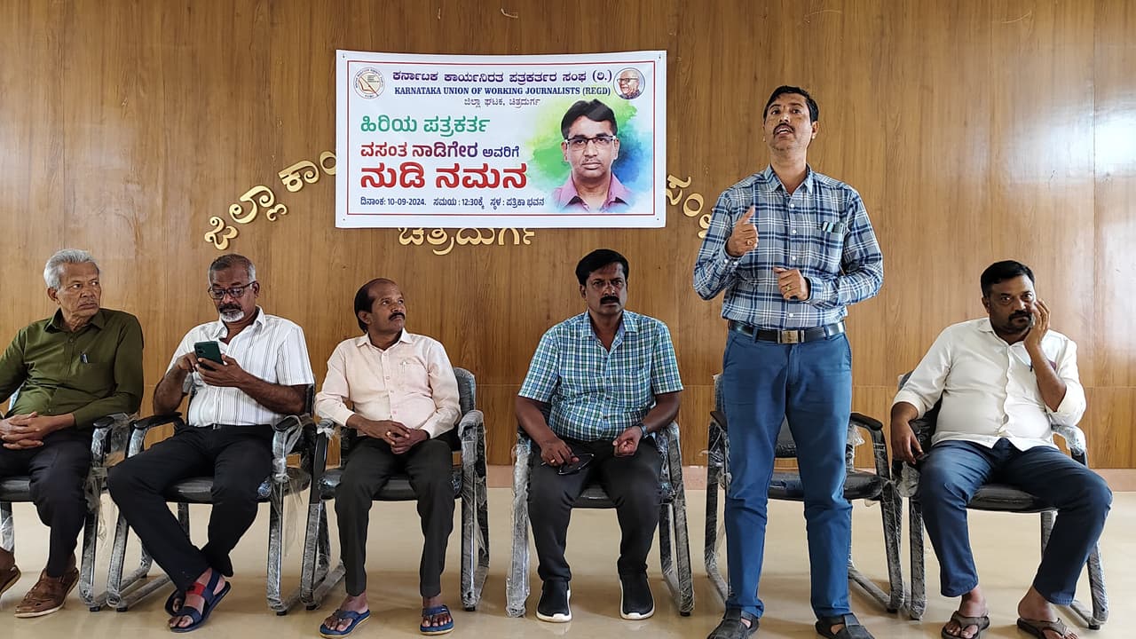 ---------ಚಿತ್ರದುರ್ಗದ ಕಾರ್ಯನಿರತರ ಪತ್ರಕರ್ತರ ಸಂಘದ ವತಿಯಿಂದ ಮಂಗಳವಾರ ಆಯೋಜಿಸಿದ್ದ ವಸಂತನಾಡಿಗೇರ ಅವರ ನುಡಿನಮನ ಕಾರ್ಯಕ್ರಮದಲ್ಲಿ ಜಿಲ್ಲಾ ವಾರ್ತಾಧಿಕಾರಿ ತುಕಾರಂ ಮಾತನಾಡಿದರು.10 ಸಿಟಿಡಿ6