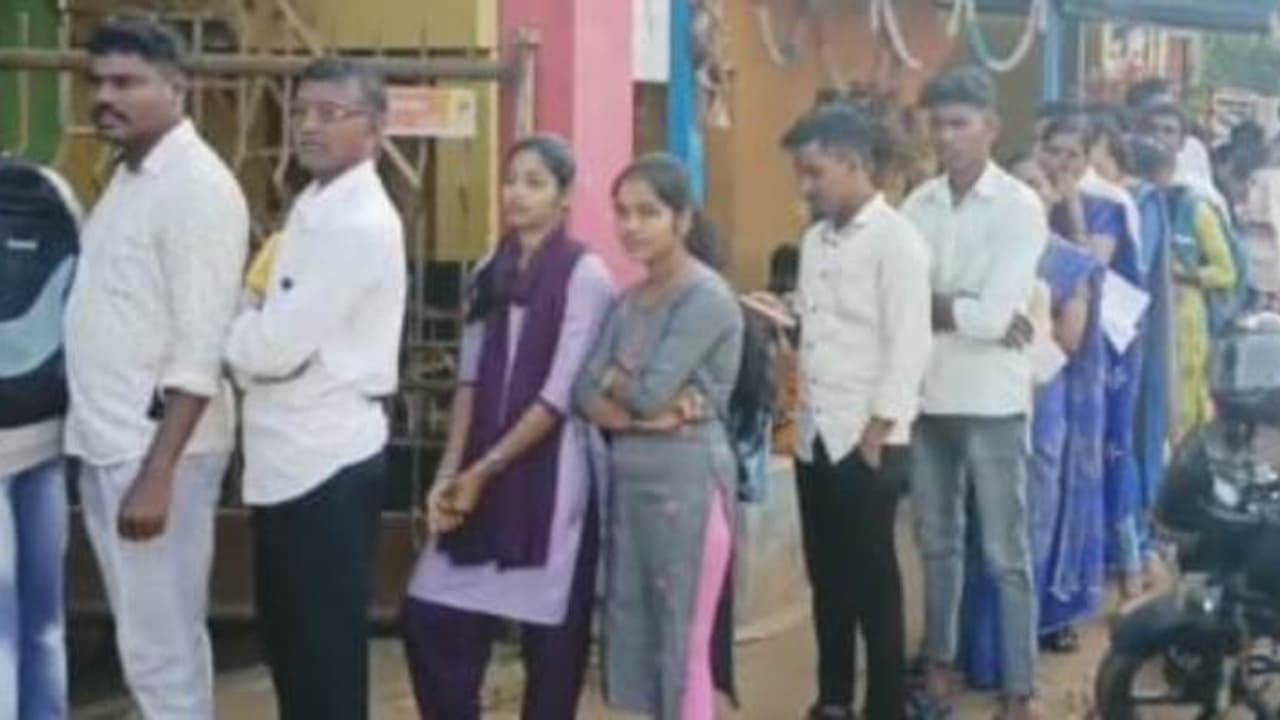 ಸೊರಬ ಪಟ್ಟಣದ ಉಪ ಅಂಚೆ ಕಚೇರಿ ಮುಂಭಾಗದಲ್ಲಿ ಆಧಾರ್ ಕಾರ್ಡ್ ತಿದ್ದುಪಡಿಗಾಗಿ ಸರತಿ ಸಾಲಿನಲ್ಲಿ ನಿಂತಿರುವ ಗ್ರಾಮಸ್ಥರು, ಮಕ್ಕಳು, ವಿದ್ಯಾರ್ಥಿಗಳು.