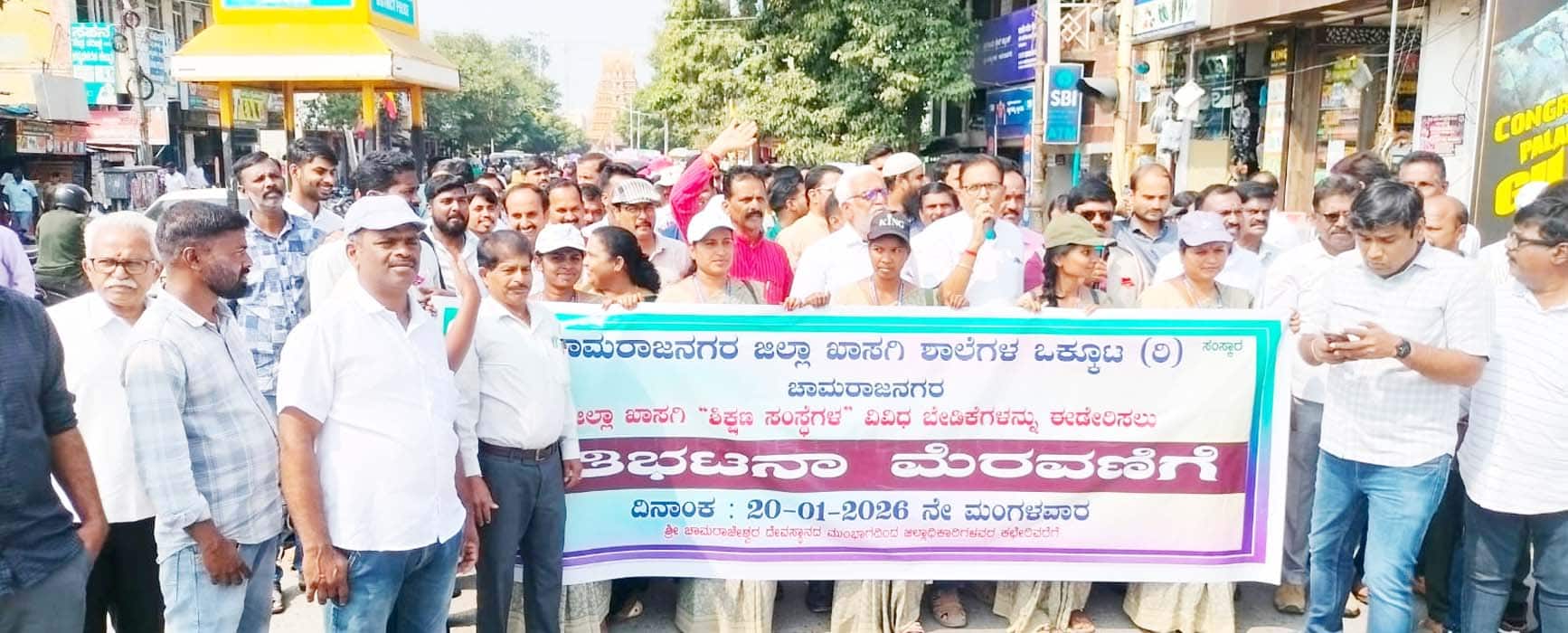 ಖಾಸಗಿ ಶಿಕ್ಷಣ ಸಂಸ್ಥೆಗಳ ವಿರುದ್ಧ ಶಾಲಾ ಮಾನ್ಯತೆ ನವೀಕರಣ ಸೇರಿದಂತೆ ಸರ್ಕಾರ ಹೇರಿರುವ ನಿಬಂಧನೆಗಳನ್ನು ಖಂಡಿಸಿ ಜಿಲ್ಲಾ ಖಾಸಗಿ ಶಿಕ್ಷಣ ಸಂಸ್ಥೆಗಳ ಒಕ್ಕೂಟದ ವತಿಯಿಂದ ಭಾರಿ ಪ್ರತಿಭಟನೆ ನಡೆಸಿ, ಜಿಲ್ಲಾಡಳಿತದ ಮೂಲಕ ಸರ್ಕಾರಕ್ಕೆ ಮನವಿ ಸಲ್ಲಿಸಲಾಯಿತು.ನಗರದ ಶ್ರೀಚಾಮರಾಜೇಶ್ವರ ಉದ್ಯಾನವನದ ಮುಂಭಾಗದಲ್ಲಿ ಸಮಾವೇಶಗೊಂಡ ಪ್ರತಿಭಟನಾನಿರತರು ಅಲ್ಲಿಂದ ಮೆರವಣಿಗೆ ಹೊರಟು ಭುವನೇಶ್ವರಿ ವೃತ್ತ, ಬಿ.ರಾಚಯ್ಯ ಜೋಡಿರಸ್ತೆ ಮೂಲಕ ಜಿಲ್ಲಾಡಳಿತ ಭವನಕ್ಕೆ ತೆರಳಿ ಕೆಲಕಾಲ ಪ್ರತಿಭಟನೆ ನಡೆಸಿ ಜಿಪಂ ಸಿಇಒ ಮೋನಾರೋತ್ ಅವರ ಮೂಲಕ ಮುಖ್ಯಮಂತ್ರಿ ಗಳಿಗೆ ಮನವಿ ಸಲ್ಲಿಸಿದರು.