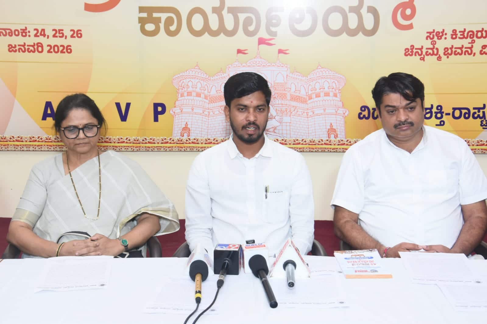 ಅಖಿಲ ಭಾರತೀಯ ವಿದ್ಯಾರ್ಥಿ ಪರಿಷತ್ ಕರ್ನಾಟಕ ಉತ್ತರ ಪ್ರಾಂತದ 45ನೇ ಪ್ರಾಂತ ಸಮ್ಮೇಳನವು ನಗರದ ರಾಣಿ ಚನ್ನಮ್ಮ ಮಂಗಲ ಕಾರ್ಯಾಲಯದಲ್ಲಿ ಜ.24, 25 ಹಾಗೂ 26ರಂದು ನಡೆಯಲಿದೆ ಎಂದು ಎಬಿವಿಪಿ ರಾಜ್ಯ ಕಾರ್ಯದರ್ಶಿ ಸಚಿನ ಕುಳಗೇರಿ ಹೇಳಿದರು.ನಗರದ ಎಬಿವಿಪಿ ಪ್ರೇರಣಾ ಕಾರ್ಯಾಲಯದಲ್ಲಿ ಸುದ್ದಿಗೋಷ್ಠಿ ನಡೆಸಿ ಮಾತನಾಡಿದ ಅವರು, ಈ ಸಮ್ಮೇಳನಕ್ಕೆ ಉತ್ತರ ಪ್ರಾಂತದ 6 ವಿಭಾಗಗಳ 16 ಜಿಲ್ಲೆಗಳಿಂದ ಸುಮಾರು 700 ವಿದ್ಯಾರ್ಥಿಗಳು, 300 ವಿದ್ಯಾರ್ಥಿನಿಯರು ಮತ್ತು 100ಕ್ಕೂ ಹೆಚ್ಚು ಅಧ್ಯಾಪಕರು ಮತ್ತು ಶಿಕ್ಷಣ ತಜ್ಞರು ಸೇರಿ ಒಟ್ಟು 1100ಕ್ಕೂ ಅಧಿಕ ಪ್ರತಿನಿಧಿಗಳು ಭಾಗವಹಿಸಲಿದ್ದಾರೆ ಎಂದರು.