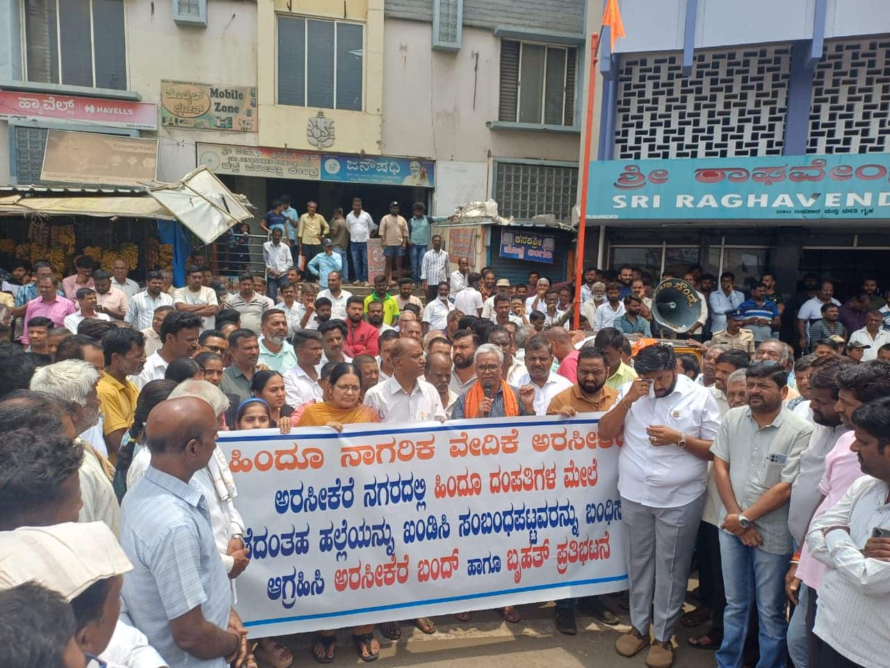 ನಗರದಲ್ಲಿ ಜೇನುಕಲ್ ಬೆಟ್ಟದ ಜಾತ್ರೆ ಮುಗಿಸಿಕೊಂಡು ಮನೆಗೆ ಮರಳುತ್ತಿದ್ದ ದಂಪತಿಯೊಂದಿಗೆ ಮಾತಿನ ಚಕಮಕಿಯ ಹಿನ್ನೆಲೆ ಯುವಕನ ಮೇಲೆ ಹಲ್ಲೆ ನಡೆದಿರುವ ಆರೋಪಕ್ಕೆ ಸಂಬಂಧಿಸಿ ಅರಸೀಕೆರೆಯಲ್ಲಿ ಶುಕ್ರವಾರ ರಾತ್ರಿ ತೀವ್ರ ಉದ್ವಿಗ್ನತೆ ಉಂಟಾಗಿ, ಶನಿವಾರ ಬೆಳಗ್ಗೆ ಅದೇ ವಿಚಾರ ದೊಡ್ಡ ಮಟ್ಟದ ಪ್ರತಿಭಟನೆಯಾಗಿ ಮಾರ್ಪಟ್ಟಿತು. ಆರೋಪಿಗಳ ವಿರುದ್ಧ ತಕ್ಷಣ ಕ್ರಮ ಕೈಗೊಳ್ಳಲಿಲ್ಲವೆಂದು ಆಕ್ರೋಶ ವ್ಯಕ್ತಪಡಿಸಿದ ಹಿಂದೂಪರ ಸಂಘಟನೆಗಳು ಹಾಗೂ ಸ್ಥಳೀಯ ಮುಖಂಡರು ಮೊದಲು ನಗರ ಪೊಲೀಸ್ ಠಾಣೆ ಮುಂಭಾಗ ರಾತ್ರಿ ಪ್ರತಿಭಟನೆ ನಡೆಸಿ, ನಂತರ ಪಿ.ಪಿ. ವೃತ್ತದಿಂದ ಟ್ರೇಂಡ್ಸ್ ತನಕ ಜಾಥಾ ನಡೆಸಿ ಟ್ರೆಂಡ್ಸ್ ಬಳಿ ಮಾನವ ಸರಪಳಿ ಹಾಗೂ ರಸ್ತೆ ತಡೆ ನಡೆಸಿದರು.ಜಾತ್ರೆಯಿಂದ ವಾಪಸ್ಸಾಗುತ್ತಿದ್ದ ವೇಳೆ ಮಾತಿನ ಚಕಮಕಿ: