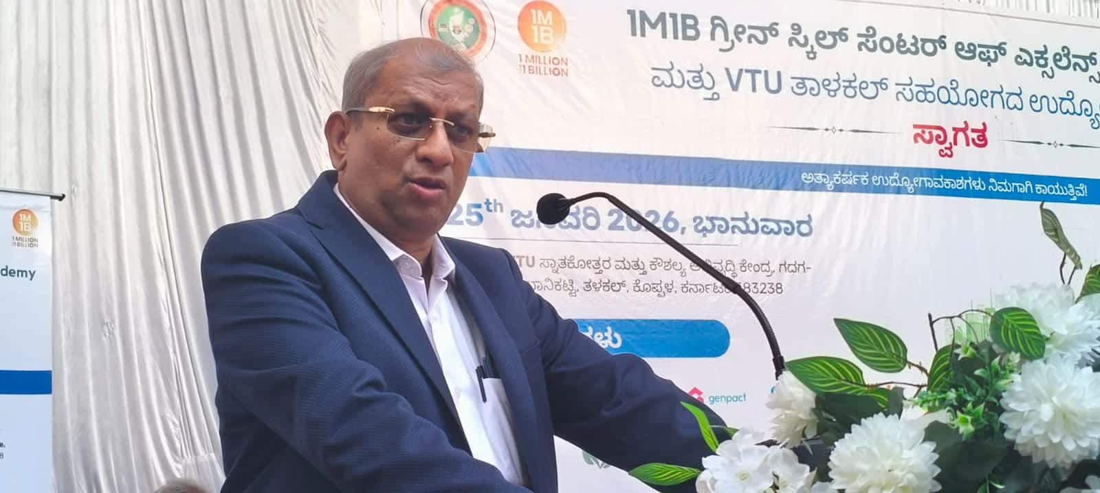 ತಾಲೂಕಿನ ತಳಕಲ್ಲಿನ ವಿಟಿಯು ಸ್ನಾತಕೋತ್ತರ ಮತ್ತು ಕೌಶಲ್ಯ ಅಭಿವೃದ್ಧಿ ಕೇಂದ್ರದಲ್ಲಿ ೧ಎಂ೧ಬಿ ಗ್ರೀನ್ ಸ್ಕಿಲ್ ಸೆಂಟರ್ ಆಫ್ ಎಕ್ಸಲೆನ್ಸ್ ಉದ್ಘಾಟನೆ ಮತ್ತು ವಿಟಿಯು ತಳಕಲ್ ಆಶ್ರಯದಲ್ಲಿ ಜರುಗಿದ ಉದ್ಯೋಗ ಮೇಳವನ್ನುದ್ದೇಶಿಸಿ ಮಾತನಾಡಿದ ಅವರು, ಎಐ ಆವಿಷ್ಕಾರದಿಂದ ನಮಗೆ 700 ಮಿಲಿಯನ್ ಮೆಡಿಕಲ್ ವಿಟಾಮಿನ್ ಇರುವ ಔಷಧಿ ಕಂಡು ಹಿಡಿಯಲು ಸಾಧ್ಯವಾಯಿತು. ಆದರಿಂದ ಕೊರೋನಾ ಲಸಿಕೆ ಸಹ ಲಭ್ಯವಾಯಿತು. ಎಐಯಿಂದ ಅನುಕೂಲವಾದಷ್ಟೇ ತೊಂದರೆ ಸಹ ಆಗುತ್ತಿದೆ ಎಂದರು.ಭಾರತದಲ್ಲಿ ಇನ್ನೂ ಎಐ ಬಳಕೆ ಇಲ್ಲ. ಹೆಚ್ಚಿನ ಪ್ರಮಾಣದಲ್ಲಿ ಯುವ ಜನತೆ ಕೌಶಲ್ಯ ಪರಿಣತಿ ಕಲಿಯುವ ಮೂಲಕ ಸ್ವಯಂ ಉದ್ಯೋಗದತ್ತ ಹೆಚ್ಚು ಗಮನ ಹರಿಸಬೇಕು. ಪ್ರತಿ ವರ್ಷ ೧೫ರಿಂದ ೧೮ ಲಕ್ಷ ವಿದ್ಯಾರ್ಥಿಗಳು ಎಂಜನಿಯರ್ಗಳಾಗಿ ಹೊರಬರುತ್ತಿದ್ದಾರೆ. ಇನ್ನೂ ಉತ್ತರ ಕರ್ನಾಟಕ ಭಾಗದಲ್ಲಿ ಹಲವು ಪ್ರಮುಖ ಕಂಪನಿಯು ಉದ್ಯೋಗ ನೀಡಲು ಬಂದಾಗ ಸಾಫ್ಟ್ವೇರ್ ಕಲಿತ ವಿದ್ಯಾರ್ಥಿಗಳು ಕೇವಲ ೩೦೦ರಿಂದ ೪೦೦ ಮಾತ್ರ ದೊರೆಯುತ್ತಾರೆ. ಕೌಶಲ್ಯ ಕೊರತೆ ಇದೆ. ಎಂಜನಿಯರ್ ವಿದ್ಯಾರ್ಥಿಗಳು ಕಲಿಯುವ ಸಂದರ್ಭದಲ್ಲಿ ವ್ಯವಸ್ಥಿತವಾಗಿ ಕಲಿಯಬೇಕು. ಮೂರನೇ ವರ್ಷದ ಪಠ್ಯದಲ್ಲಿ ಎಐ ಬಗ್ಗೆ ಕಲಿಕೆಗೆ ಆದ್ಯತೆ ನೀಡಲಾಗುತ್ತದೆ ಎಂದರು.