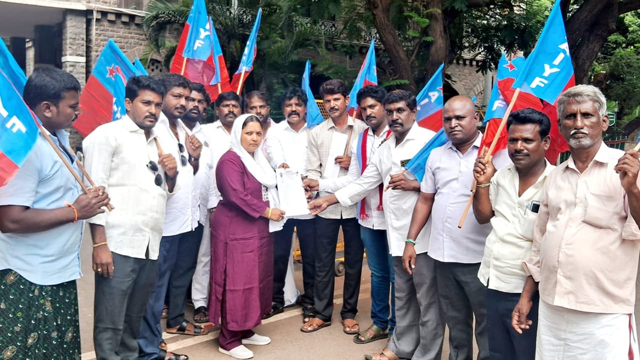 ಬಳ್ಳಾರಿ: ಅಗ್ನಿಪಥ ಯೋಜನೆ ಕೈಬಿಡುವಂತೆ ಒತ್ತಾಯಿಸಿ ಅಖಿಲ ಭಾರತ ಯುವಜನ ಫೆಡರೇಷನ್ (ಎಐವೈಎಫ್) ಸಂಡೂರು ತಾಲೂಕು ಸಮಿತಿಯ ಪದಾಧಿಕಾರಿಗಳು ಹಾಗೂ ಸದಸ್ಯರು ಇಲ್ಲಿನ ಜಿಲ್ಲಾಧಿಕಾರಿ ಕಚೇರಿ ಎದುರು ಪ್ರತಿಭಟನೆ ನಡೆಸಿ, ಜಿಲ್ಲಾಡಳಿತಕ್ಕೆ ಬುಧವಾರ ಮನವಿ ಸಲ್ಲಿಸಿದರು.