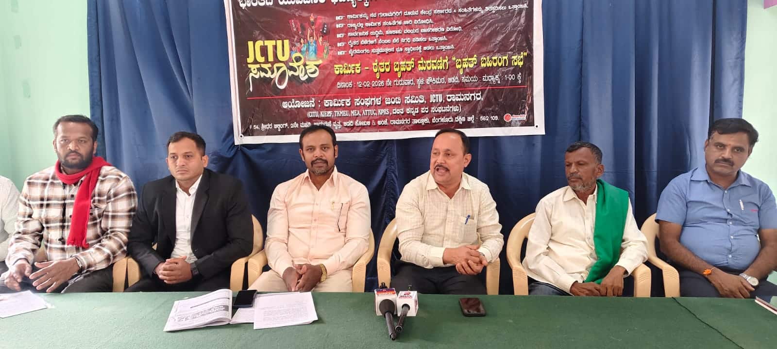 ರಾಮನಗರ: ಕೇಂದ್ರ ಸರ್ಕಾರ ಜಾರಿಗೊಳಿಸಿರುವ ನಾಲ್ಕು ಕಾರ್ಮಿಕ ಸಂಹಿತೆ ರದ್ದುಪಡಿಸಬೇಕು, ಮನರೇಗಾ ಮರು ಜಾರಿಗೊಳಿಸುವುದು ಹಾಗೂ ಬಿಡದಿ ಟೌನ್ ಶಿಪ್ ಯೋಜನೆಗೆ ಬಲವಂತದ ಭೂ ಸ್ವಾಧೀನ ಕೈಬಿಡುವುದು ಸೇರಿದಂತೆ ವಿವಿಧ ಬೇಡಿಕೆಗಳ ಈಡೇರಿಕೆಗೆ ಆಗ್ರಹಿಸಿ ಫೆ.12 ರಂದು ಅಖಿಲ ಭಾರತ ಸಾರ್ವತ್ರಿಕ ಮುಷ್ಕರ ಹಮ್ಮಿಕೊಳ್ಳಲಾಗಿದೆ ಎಂದು ಕೆಐಇಇಎಫ್ ಸಂಘಟನೆ ಅಧ್ಯಕ್ಷ ಗಂಗಣ್ಣ ತಿಳಿಸಿದರು.