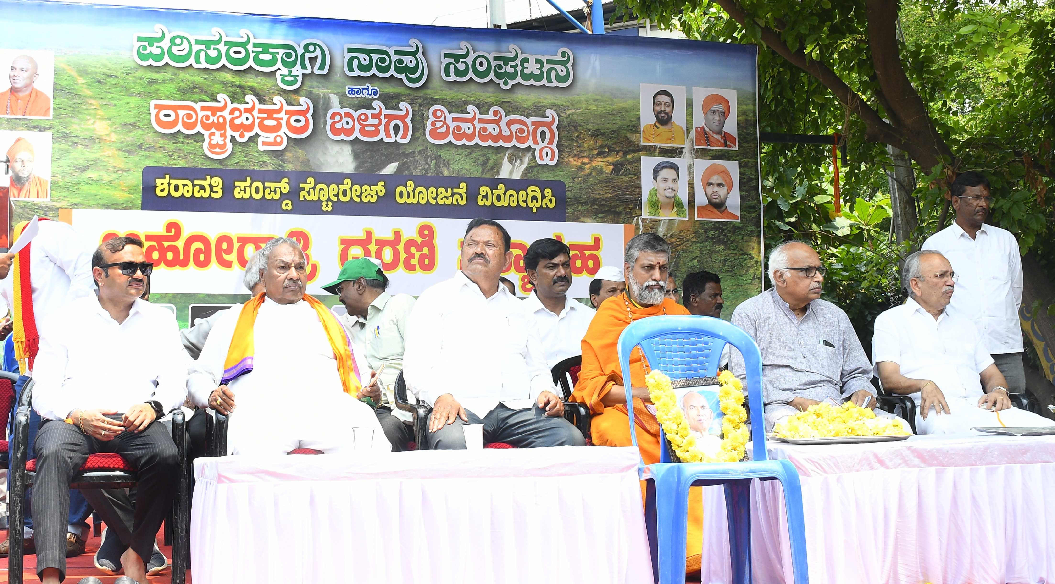 ಶರಾವತಿ ಪಂಪ್ಡ್ ಸ್ಟೋರೇಜ್ ಯೋಜನೆ ವಿರುದ್ಧ ಮಾಜಿ ಉಪಮುಖ್ಯಮಂತ್ರಿ ಕೆ.ಎಸ್.ಈಶ್ವರಪ್ಪ ನೇತೃತ್ವದಲ್ಲಿ ರಾಷ್ಟ್ರಭಕ್ತರ ಬಳಗ ಮತ್ತು ಪರಿಸರಕ್ಕಾಗಿ ನಾವು ಹಾಗೂ ವಿವಿಧ ಪರಿಸರ ಸಂಘಟನೆಗಳ ಸಹಯೋಗದಲ್ಲಿ ಮಂಗಳವಾರದಿಂದ ನಗರದ ನೆಹರು ಕ್ರೀಡಾಂಗಣದಲ್ಲಿ ಅಹೋರಾತ್ರಿ ಧರಣಿ ಆರಂಭವಾಗಿದೆ.ಕಾರ್ಯಕ್ರಮವನ್ನು ಉದ್ಘಾಟಿಸಿ ಮಾತನಾಡಿದ ಶ್ರೀ ಕ್ಷೇತ್ರ ಬಂಗಾರಮಕ್ಕಿಯ ಶ್ರೀ ಮಾರುತಿ ಗುರೂಜಿ ಅವರು, ನಮಗಾಗಿ ಈ ಹೋರಾಟಕ್ಕೆ ಸೇರಿಲ್ಲ. ಸೇರಿದ್ದು ಮುಂದಿನ ಭವಿಷ್ಯಕ್ಕಾಗಿ. ನಮ್ಮಲ್ಲಿ ಒಗ್ಗಟ್ಟಾಗುವುದೇ ಬಹಳ ಕಷ್ಟ. ಶರಾವತಿ ಪಂಪ್ಡ್ ಸ್ಟೋರೇಜ್ ಆಗಬಾರದು. ಪ್ರಕೃತಿಗೆ ವಿರುದ್ಧವಾದ ಕಾರ್ಯವಾಗಿರುವುದರಿಂದ ಇದನ್ನು ವಿರೋಧಿಸುತ್ತಿದ್ದೇವೆ ಎಂದರು.