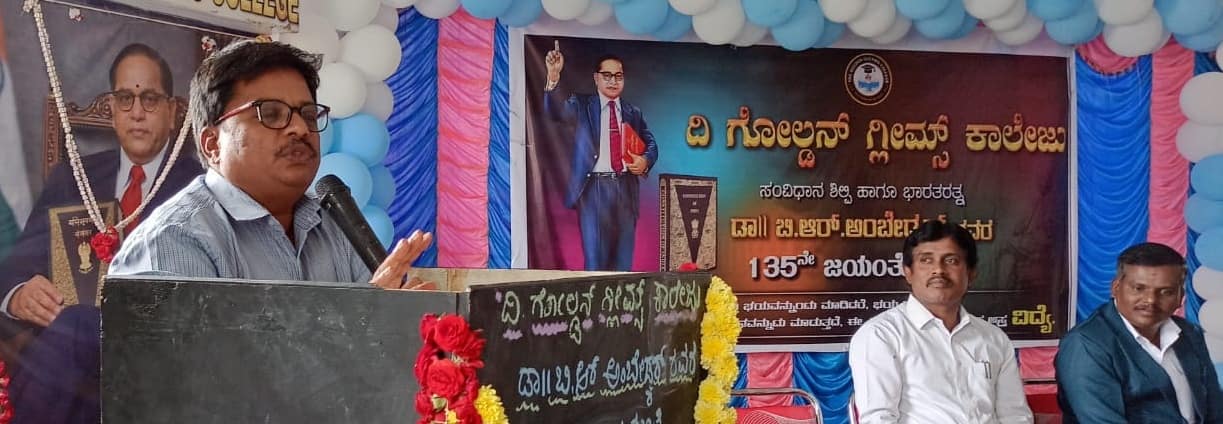 ಪ್ರಾಂಶುಪಾಲ ಸಿಎಂ ಮುನಿಕೃಷ್ಣಪ್ಪ ಮಾತನಾಡಿ, ಭಾರತ ಇಂದು ಏನಾದರೂ ಸಾಧಿಸಿದೆ ಎಂದರೆ ಆ ಸಾಧನೆಯಲ್ಲಿ ಅಂಬೇಡ್ಕರರ ಕೊಡುಗೆ ಇದೆ. ಸರ್ವರಿಗೆ ಸಮಬಾಳು ಸಮಪಾಲು ಕೊಡಲು ಶ್ರಮಿಸಿದ, ಸಾಮಾಜಿಕ ನ್ಯಾಯದ ಅಗತ್ಯವನ್ನು ಬ್ರಿಟಿಷರಿಗೆ ಮನವರಿಕೆ ಮಾಡಿಕೊಟ್ಟ ಮಹಾಜ್ಞಾನಿ ಬಾಬಾ ಸಾಹೇಬ್ ಅಂಬೇಡ್ಕರ್ ರವರು. ಅಂಬೇಡ್ಕರ್ ಎಂಬ ಜ್ಞಾನ ಸೂರ್ಯ ಭಾರತದಲ್ಲಿ ಉದಯವಾಗಲಿಲ್ಲವೆಂದಿದ್ದರೆ ಭಾರತದ ಮಹಿಳೆಯರಿಗೆ, ಕಾರ್ಮಿಕರಿಗೆ, ಶೋಷಿತರಿಗೆ, ಅಶಕ್ತರಿಗೆ ಒಟ್ಟಾರೆ ಬಹುಜನ ಭಾರತಕ್ಕೆ ಮುಕ್ತಿ ಎಂಬುದು ದೊರೆಯುತ್ತಿರಲಿಲ್ಲ ಎಂದರುಗೋಲ್ಡನ್ ಗ್ಲಿಮ್ಸ್ ಕಾಲೇಜಿನಲ್ಲಿ ನಡೆದ ಅಂಬೇಡ್ಕರ್ ಜಯಂತಿ ಕಾರ್ಯಕ್ರಮದಲ್ಲಿ ವಿದ್ಯಾರ್ಥಿಗಳು ಬಾಬಾ ಸಾಹೇಬ ಅಂಬೇಡ್ಕರ್ ಅವರ ಭಾವಚಿತ್ರವುಳ್ಳ ಬೃಹತ್ ಕೇಕನ್ನು ಕತ್ತರಿಸಿ ಸಿಹಿ ಹಂಚುವ ಮೂಲಕ ಜ್ಞಾನ ಸೂರ್ಯನ ಜಯಂತಿಗೆ ಹೊಸ ಭಾಷ್ಯ ಬರೆದರು.ಕಾರ್ಯಕ್ರಮದಲ್ಲಿ ವಿದ್ಯಾರ್ಥಿಗಳಿಂದ ಮೂಡಿಬಂದ ಭಾಷಣ ಸಭಿಕರನ್ನು ತನ್ಮಯಗೊಳಿಸಿತು. ಈ ವೇಳೆ ಕಾಲೇಜಿನ ಎಲ್ಲಾ ಬೋಧಕ ಬೋಧಕೇತರ ವರ್ಗ, ವಿದ್ಯಾರ್ಥಿ ಸಮೂಹ ಹಾಜರಿದ್ದು ಬಾಬಾ ಸಾಹೇಬರಿಗೆ ಪುಷ್ಪಾರ್ಚನೆ ಮೂಲಕ ಗೌರವ ಸಲ್ಲಿಸಿದರು.