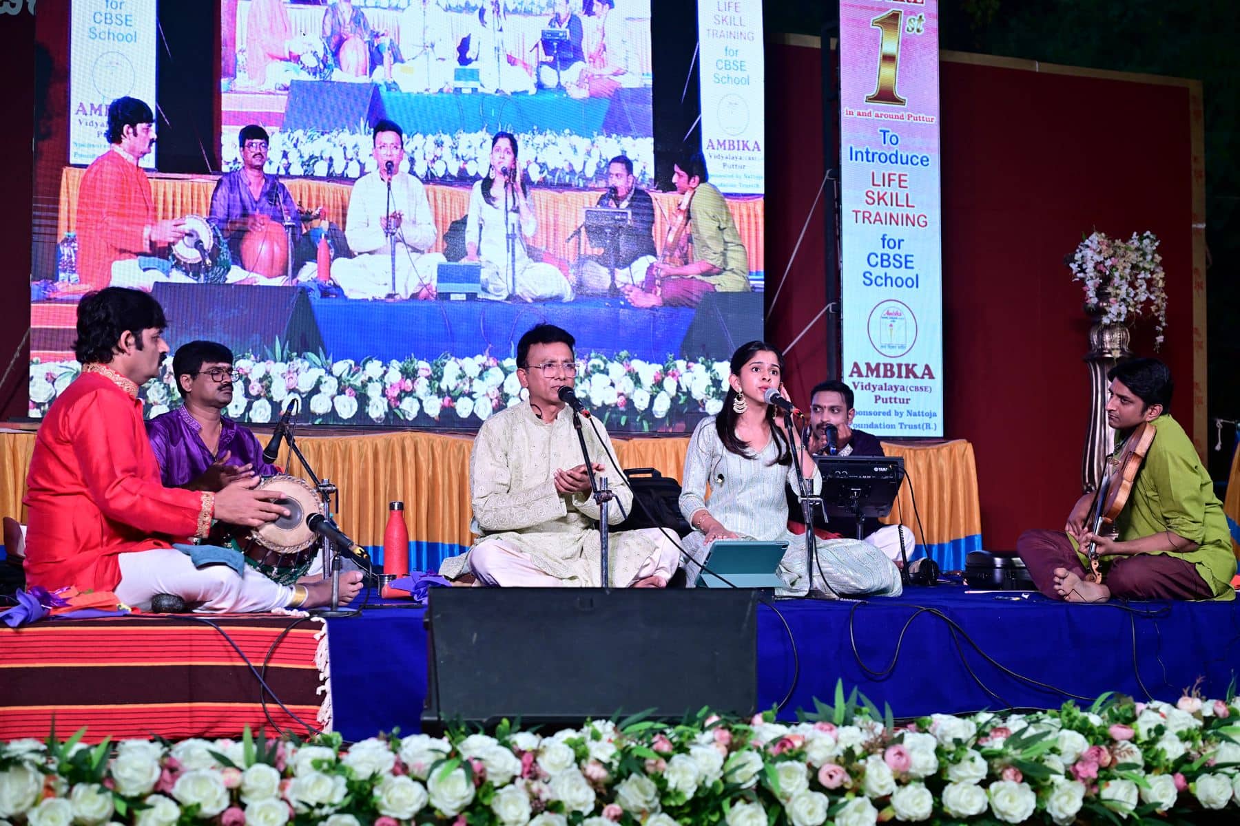 ಪುತ್ತೂರು: ನಗರದ ನಟ್ಟೋಜ ಫೌಂಡೇಶನ್ ಟ್ರಸ್ಟ್ ಮುನ್ನಡೆಸುತ್ತಿರುವ ಅಂಬಿಕಾ ಸಮೂಹ ಶಿಕ್ಷಣ ಸಂಸ್ಥೆಗಳಿಗೆ 25 ವರ್ಷ ತುಂಬಿದ ಹಿನ್ನೆಲೆಯಲ್ಲಿ ವರ್ಷಪೂರ್ತಿ ಆಚರಿಸಲಾಗುತ್ತಿರುವ ರಜತಮಹೋತ್ಸವ ಸಂಭ್ರಮದ ಅಂಗವಾಗಿ ದಕ್ಷಿಣ ಭಾರತದ ಪ್ರಸಿದ್ಧ ಗಾಯಕ, ರಾಷ್ಟ್ರಪ್ರಶಸ್ತಿ ವಿಜೇತ ಪದ್ಮಶ್ರೀ ಪಿ.ಉನ್ನಿಕೃಷ್ಣನ್ ಹಾಗೂ ಅವರ ಪುತ್ರಿ ಉತ್ತರಾ ಉನ್ನಿಕೃಷ್ಣನ್ ಮತ್ತು ತಂಡದವರಿಂದ ಶನಿವಾರ ಬಪ್ಪಳಿಗೆಯ ಶ್ರೀ ಶಂಕರ ಸಭಾಭವನದಲ್ಲಿ ಶಾಸ್ತ್ರೀಯ ಸಂಗೀತ ಕಾರ್ಯಕ್ರಮ ನಡೆಸಲಾಯಿತು.ವಿದ್ವಾನ್ ನಿಶಾನ್ ಚಂದ್ರನ್ ವಾಯಲಿನ್ನಲ್ಲಿ, ವಿದ್ವಾನ್ ತುಮಕೂರು ಬಿ.ರವಿಶಂಕರ್ ಮೃದಂಗದಲ್ಲಿ, ವಿದ್ವಾನ್ ತುಮಕೂರು ಬಿ. ಶಶಿಶಂಕರ್ ಘಟಂನಲ್ಲಿ ಹಾಗೂ ವಿದ್ವಾನ್ ವಿಕ್ರಮ್ ಭಾರದ್ವಾಜ್ ಅವರು ಮೋರ್ಚಿಂಗ್ ಹಾಗೂ ರಿದಂಪಾಡ್ನಲ್ಲಿ ಸಹಕರಿಸಿದರು.ಕೋಟೆಕಾರಿನ ಶಂಕರಮಠ ನಡೆಸುವ ಸಂಗೀತ ಶಾಲೆಯ ಗುರು ವಿದುಷಿ ನಾರಾಯಣಿ ಬೊಳ್ಳಾವ ಕಾರ್ಯಕ್ರಮ ಉದ್ಘಾಟಿಸಿದರು. ಕೋಟೆಕಾರು ಶಂಕರ ಮಠದ ಧರ್ಮಾಧಿಕಾರಿ ಸತ್ಯಶಂಕರ ಬೊಳ್ಳಾವ, ಅಂಬಿಕಾ ಸಮೂಹ ಶಿಕ್ಷಣ ಸಂಸ್ಥೆಗಳ ಕಾರ್ಯದರ್ಶಿ ಸುಬ್ರಹ್ಮಣ್ಯ ನಟ್ಟೋಜ, ಕೋಶಾಧಿಕಾರಿ ರಾಜಶ್ರೀ ಎಸ್ ನಟ್ಟೋಜ, ಆಡಳಿತ ಮಂಡಳಿ ಸದಸ್ಯರಾದ ಬಿ.ಪುರಂದರ ಭಟ್, ಸುರೇಶ್ ಶೆಟ್ಟಿ ಕೆ., ಡಾ.ಎಚ್.ಮಾಧವ ಭಟ್, ಬಾಲಕೃಷ್ಣ ಬೋರ್ಕರ್, ಪ್ರಸನ್ನ ಭಟ್, ವಿದ್ವಾನ್ ಕಾಂಚನ ಈಶ್ವರ ಭಟ್, ವಿಶ್ರಾಂತ ಪ್ರಾಧ್ಯಾಪಕ ಪ್ರೊ.ವಿ.ಬಿ.ಅರ್ತಿಕಜೆ ಮತ್ತಿತರರಿದ್ದರು. ವಿದುಷಿ ನಾರಾಯಣಿ ಬೊಳ್ಳಾವ ಹಾಗೂ ಕಾಂಚನ ಈಶ್ವರ ಭಟ್ ಅವರನ್ನು ಸನ್ಮಾನಿಸಲಾಯಿತು.ಪಿಬರೇ ರಾಮರಸಂ, ಬೋಲಾವ ವಿಠಲ ಪಹಾವ ವಿಠಲ, ಯಾದವ ನೀ ಬಾ ಯದುಕುಲ ನಂದನ ಮಾಧವ ಮಧುಸೂದನ, ಅಚ್ಯುತಂ ಕೇಶವಂ ಕೃಷ್ಣ ದಾಮೋದರಂ ರಾಮ ನಾರಾಯಣಂ ಜಾನಕೀ ವಲ್ಲಭಂ, ಭಾಗ್ಯದಾ ಲಕ್ಷ್ಮೀ ಬಾರಮ್ಮಾ, ಬ್ರಹ್ಮ ಒಕ್ಕಟೇ ಪರಬ್ರಹ್ಮ ಒಕ್ಕಟೇ ಮೊದಲಾದ ಹಾಡುಗಳು ಜನಮನ ಸೂರೆಗೊಂಡಿತು.