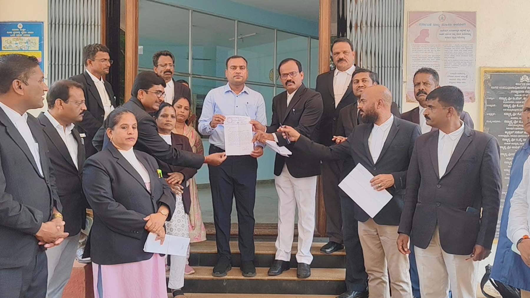 ತಾಲೂಕು ಕಚೇರಿಯ ದಾಖಲಾತಿ ಕೊಠಡಿಯಲ್ಲಿ ದಾಖಲಾತಿಗಳ ತಿದ್ದುಪಡಿಯನ್ನು ತಡೆಗಟ್ಟುವುದು, ದಾಖಲಾತಿ ಬಗ್ಗೆ ಸೂಕ್ತ ನಿಗಾವಹಿಸುವಂತೆ ಒತ್ತಾಯಿಸಿ ಗುರುವಾರ ವಕೀಲರ ಸಂಘದಿಂದ ಉಪವಿಭಾಗಾಧಿಕಾರಿಗಳಿಗೆ ಮನವಿ ಸಲ್ಲಿಸಲಾಯಿತು.
