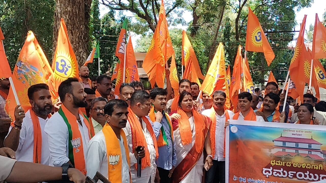 ಕಾರವಾರ: ಧರ್ಮಸ್ಥಳದ ಹೆಸರಿಗೆ ಅಪಪ್ರಚಾರ ಮಾಡುತ್ತಿರುವುದನ್ನು ಖಂಡಿಸಿ ಬಿಜೆಪಿ ಕಾರವಾರ ಘಟಕದಿಂದ ನಗರದ ತಹಸೀಲ್ದಾರ್ ಕಚೇರಿ ಬಳಿ ಸೋಮವಾರ ಪ್ರತಿಭಟನೆ ನಡೆಯಿತು.