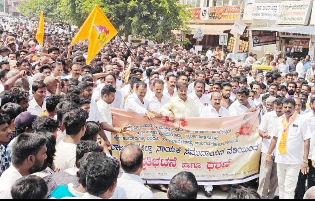 ಚಾಮರಾಜನಗರ: ತಾಲೂಕಿನ ಜ್ಯೋತಿಗೌಡನಪುರದಲ್ಲಿ ಡಾ.ಬಿ.ಆರ್.ಅಂಬೇಡ್ಕರ್ ಪ್ಲೆಕ್ಸ್ ಮತ್ತು ಬುದ್ದ ಪ್ರತಿಮೆಯನ್ನು ಧ್ವಂಸಗೊಳಿಸಿರುವ ಘಟನೆ ಸಂಬಂಧ ನೈಜ ಆರೋಪಿಗಳನ್ನು ಬಂಧಿಸಿ, ಎಸ್ಐಟಿ ತನಿಖೆ ನಡೆಸಬೇಕೆಂದು ಆಗ್ರಹಿಸಿ ಮೈಸೂರು ಮತ್ತು ಚಾಮರಾಜನಗರ ಜಿಲ್ಲಾ ನಾಯಕ ಕ್ಷೇಮಾಭಿವೃದ್ಧಿ ಸಂಘದಿಂದ ನಗರದಲ್ಲಿ ಬೃಹತ್ ಪ್ರತಿಭಟನೆ ನಡೆಸಿ, ಜಿಲ್ಲಾಡಳಿತಕ್ಕೆ ಮನವಿ ಸಲ್ಲಿಸಲಾಯಿತು.