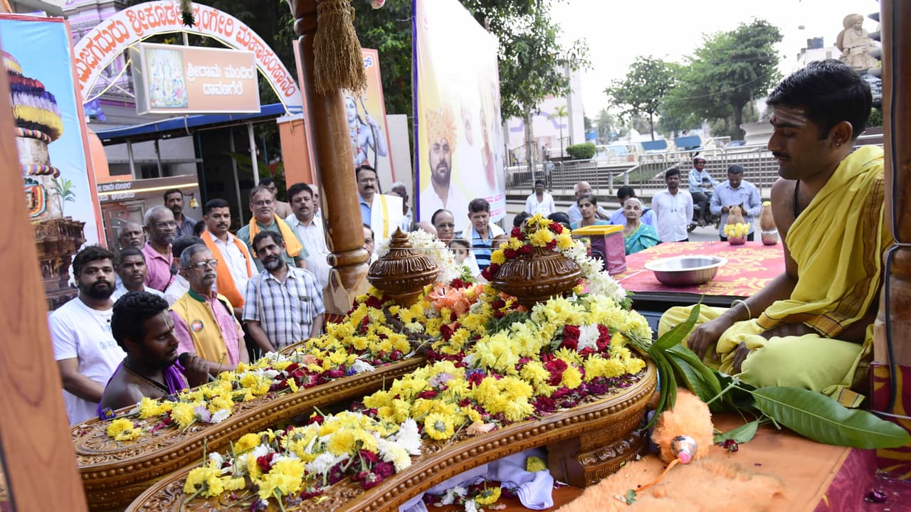 ದಾವಣಗೆರೆಗೆ ಆಗಮಿಸಿದ ಶ್ರೀಮದ್ ಜಗದ್ಗುರು ಶ್ರೀ ಶಂಕರಾಚಾರ್ಯರ ಶ್ರೀ ಮಹಾಪಾದುಕೆಯ ಅದ್ವೈತ ರಥವನ್ನು ಅದ್ಧೂರಿಯಾಗಿ ಸ್ವಾಗತಿಸಲಾಯಿತು.