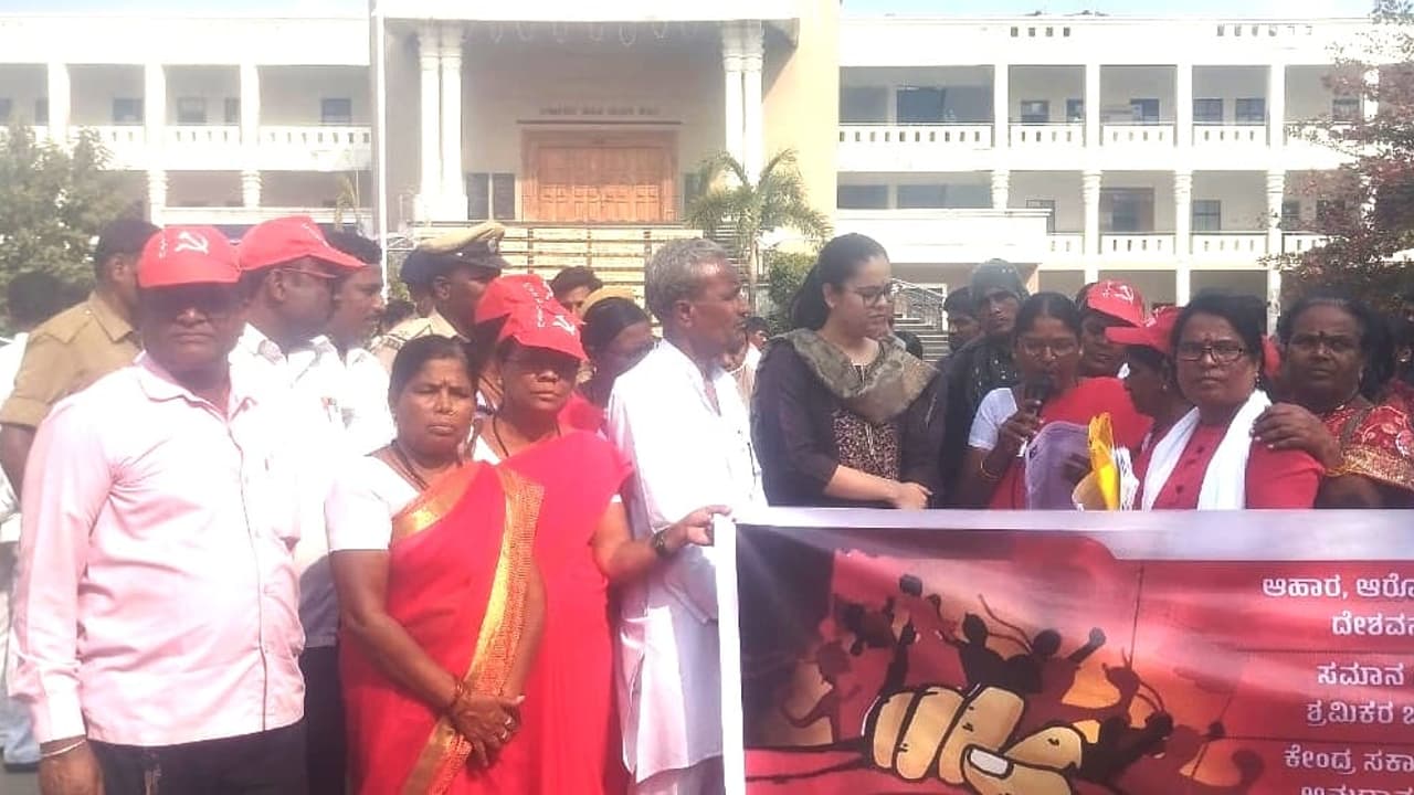 ಅಂಗನವಾಡಿ ನೌಕರರು ಮತ್ತು ಬಿಸಿಯೂಟ ನೌಕರರಿಗೆ ಹಾಗೂ ಆಶಾ ಮತ್ತು ಇತರೆ ಸಿಬ್ಬಂದಿಗೆ ₹31 ಸಾವಿರ ಕನಿಷ್ಠ ವೇತನ ಜಾರಿಗೊಳಿಸಿ, ಇತರೆ ಬೇಡಿಕೆಗಳನ್ನು ಈಡೇರಿಸಬೇಕು ಎಂದು ಆಗ್ರಹಿಸಿ ಸಂಸದರ ಕಚೇರಿ ಚಲೋ ಅಂಗವಾಗಿ ಸ್ಕೀಮ್ ನೌಕರರ ಸಂಘಟನೆಗಳು ಮತ್ತು ಸಿಐಟಿಯು ನೇತೃತ್ವದಲ್ಲಿ ಅಂಗನವಾಡಿ, ಬಿಸಿಯೂಟ ನೌಕರರು ಮಂಗಳವಾರ ಜಿಲ್ಲಾಧಿಕಾರಿ ಕಚೇರಿ ಎದುರು ಪ್ರತಿಭಟನೆ ನಡೆಸಿದರು.