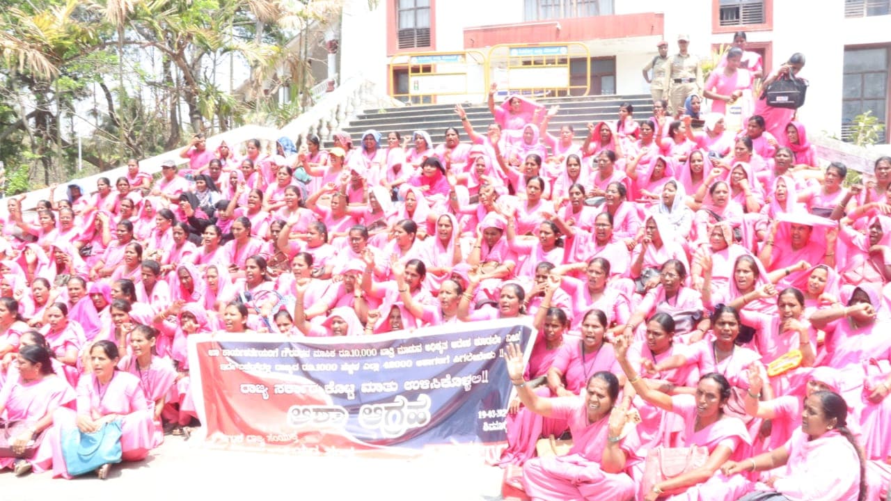 ಶಿವಮೊಗ್ಗ: ರಾಜ್ಯದ ಮುಖ್ಯಮಂತ್ರಿಗಳು ಘೋಷಿಸಿರುವಂತೆ ಆಶಾ ಕಾರ್ಯಕರ್ತೆರಿಗೆ ಪ್ರೋತ್ಸಾಹ ಧನ ಸೇರಿಸಿ ಕನಿಷ್ಠ 10,000 ರು. ಮಾಸಿಕ ಗೌರವಧನ ಜೊತೆಗೆ 1 ಸಾವಿರ ರು. ಹೆಚ್ಚಿನ ಗೌರವಧನವನ್ನು ಕಾರ್ಯಕರ್ತರಿಗೆ ನೀಡುವಂತೆ ಆಗ್ರಹಿಸಿ ರಾಜ್ಯ ಸಂಯುಕ್ತ ಆಶಾ ಕಾರ್ಯಕರ್ತೆಯ ಸಂಘದ ಜಿಲ್ಲಾ ಸಮಿತಿ ವತಿಯಿಂದ ಬುಧವಾರ ಜಿಲ್ಲಾಧಿಕಾರಿ ಕಚೇರಿ ಎದುರು ಪ್ರತಿಭಟನೆ ನಡೆಸಲಾಯಿತು.