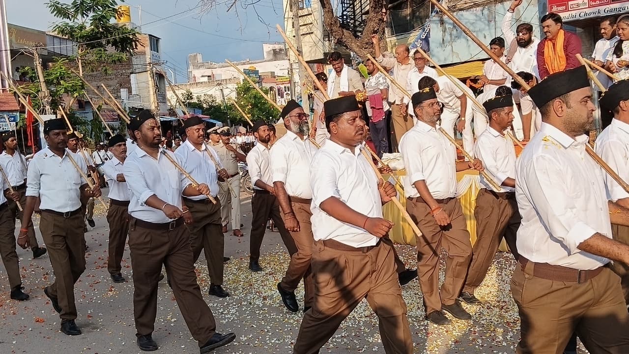 ವಿಜಯದಶಮಿ ನಿಮಿತ್ತ ರಾಷ್ಟ್ರೀಯ ಸ್ವಯಂ ಸೇವಕ ಸಂಘದ ಸ್ವಯಂ ಸೇವಕರಿಂದ ಆಕರ್ಷಕ ಪಥ ಸಂಚಲನ ಭಾನುವಾರ ಜರುಗಿತು.