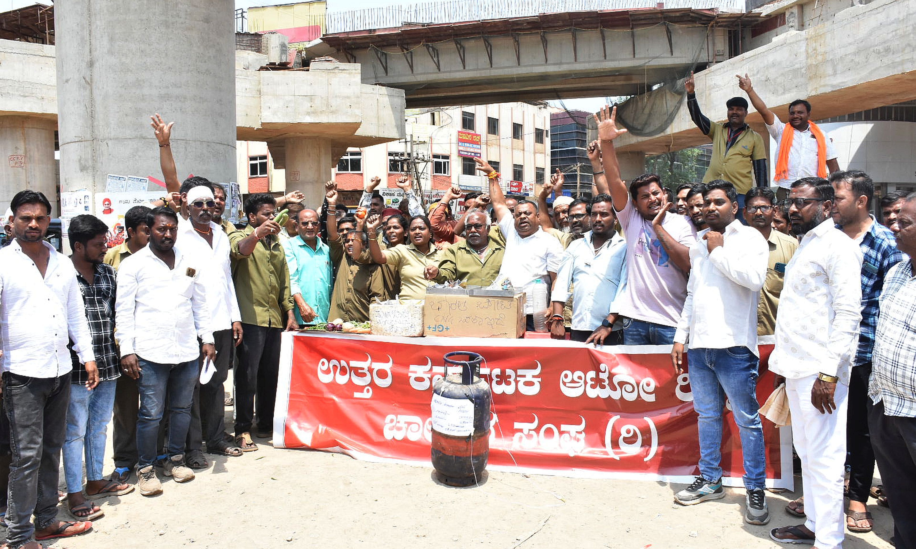 ಎಲ್ಪಿಜಿ, ಪೆಟ್ರೋಲ್ ಡೀಸೆಲ್ ಬೆಲೆ ಇಳಿಸಬೇಕು ಮತ್ತು ಆಟೋ ಚಾಲಕರ ವಿವಿಧ ಬೇಡಿಕೆ ಈಡೇರಿಕೆಗೆ ಆಗ್ರಹಿಸಿ ಉತ್ತರ ಕರ್ನಾಟಕ ಆಟೋ ರಿಕ್ಷಾ ಚಾಲಕರ ಸಂಘದ ಪದಾಧಿಕಾರಿಗಳು ರಸ್ತೆಯಲ್ಲಿ ಖಾಲಿ ಸಿಲಿಂಡರ್ ಇಟ್ಟು ಶುಕ್ರವಾರ ಪ್ರತಿಭಟನೆ ನಡೆಸಿದರು.ಇಲ್ಲಿನ ನಿಲಿಜಿಯನ್ ರಸ್ತೆಯಿಂದ ತಹಸೀಲ್ದಾರ್ ಕಚೇರಿಯ ವರೆಗೆ ಪ್ರತಿಭಟನಾ ಮೆರವಣಿಗೆ ನಡೆಸಿದ ಅವರು, ಕೇಂದ್ರ ಹಾಗೂ ರಾಜ್ಯ ಸರ್ಕಾರದ ವಿರುದ್ಧ ಘೋಷಣೆ ಕೂಗಿ ಆಕ್ರೋಶ ವ್ಯಕ್ತಪಡಿಸಿದರು. ಅಲ್ಲದೇ, ರಸ್ತೆ ಮಧ್ಯದಲ್ಲಿ ಖಾಲಿ ಸಿಲಿಂಡರ್ ಹಾಗೂ ಅಗತ್ಯ ವಸ್ತು ಇಟ್ಟು ಬೆಲೆ ಏರಿಕೆ ಖಂಡಿಸಿದರು. ನಂತರ ತಹಸೀಲ್ದಾರ್ ಮೂಲಕ ಪ್ರಧಾನಿ ನರೇಂದ್ರ ಮೋದಿ ಹಾಗೂ ಸಿಎಂ ಸಿದ್ದರಾಮಯ್ಯ ಮನವಿ ಸಲ್ಲಿಸಿದರು.