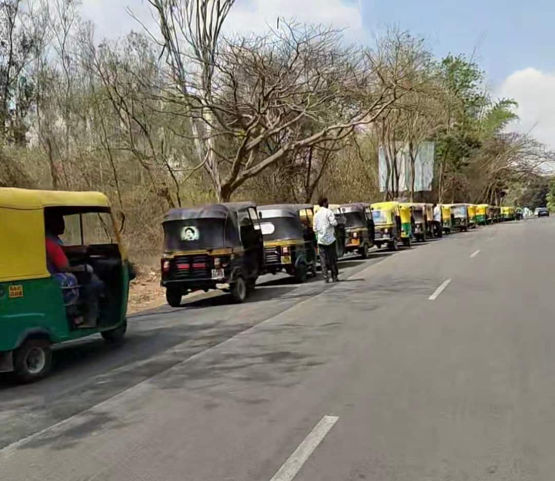 ರಾಮನಗರ ಹೊರವಲಯದ ಪ್ರೊಪೆಲ್ ಬಂಕ್ ಬಳಿ ಗ್ಯಾಸ್ ಗಾಗಿ ಆಟೋಗಳು ಸಾಲುಗಟ್ಟಿ ನಿಂತಿರುವುದು.