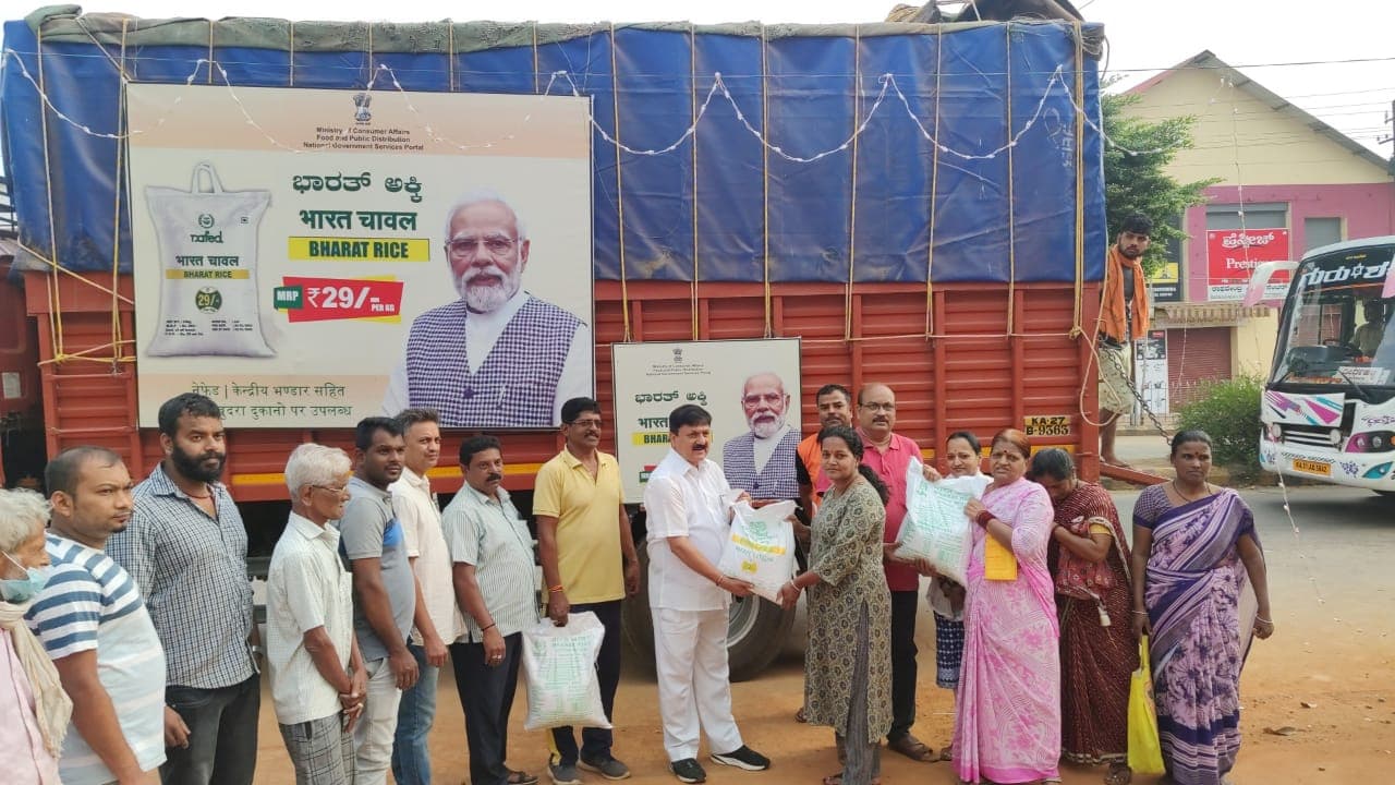 ಸೋಮವಾರ ಪಟ್ಟಣದ ತಾಲೂಕು ಕಚೇರಿ ಎದುರು ಭಾರತ್ ಅಕ್ಕಿ ಯೋಜನೆಯಲ್ಲಿ ಮೊದಲ ಕಂತಿನಲ್ಲಿ ತಾಲೂಕಿಗೆ ಬಂದಿದ್ದ 10 ಕೆಜಿ ತೂಕದ 2000 ಬ್ಯಾಗ್ ಅಕ್ಕಿ ವಿತರಣೆಗೆ ಚಾಲನೆ ನೀಡಿ ಅವರು ಮಾತನಾಡಿದರು. ಕೇಂದ್ರ ಸರ್ಕಾರ ಈಗಾಗಲೇ ಶಾಶ್ವತವಾಗಿ 5 ಕೆಜಿ ಅಕ್ಕಿಯನ್ನು ವಿತರಣೆ ಮಾಡುತ್ತಿದೆ. ಭಾರತ್ ಅಕ್ಕಿ ಯೋಜನೆಯಲ್ಲಿ ಕೆಜಿಗೆ ₹29 ರಂತೆ ₹290 ರೂಗಳಿಗೆ 10 ಕೆಜಿ ಅಕ್ಕಿಯನ್ನು ಇಂದಿನಿಂದ ವಿತರಿಸಲಾಗುತ್ತಿದೆ. ಈ ದಿನ ತಾಲೂಕಿಗೆ 2000 ಬ್ಯಾಗ್ ಅಕ್ಕಿ ಬಂದಿದ್ದು ಕೇಂದ್ರ ಸರ್ಕಾರದ ಈ ಸೌಲಭ್ಯವನ್ನು ಎಲ್ಲರೂ ಪಡೆದುಕೊಳ್ಳಬಹುದಾಗಿದೆ ಎಂದರು.ಅಕ್ಕಿ ಖರೀದಿಸಲು ತಾಲೂಕು ಕಚೇರಿ ಎದುರು ಬೆಳ್ಳಂಬೆಳಗ್ಗೆಯಿಂದಲೇ ಉದ್ದದ ಸಾಲು ನಿರ್ಮಾಣವಾಗಿತ್ತು. ಈ ಸಂದರ್ಭದಲ್ಲಿ ಪ.ಪಂ. ಸದಸ್ಯ ಸಂದೇಶ್ ಜವಳಿ, ಬಿಜೆಪಿ ಮುಖಂಡರಾದ ಟಿ.ಎನ್. ಅನಿಲ್ ಹಾಗೂ ಸಂತೋಷ್ ದೇವಾಡಿಗ ಇದ್ದರು.- - - -11ಟಿಟಿಎಚ್ 01: