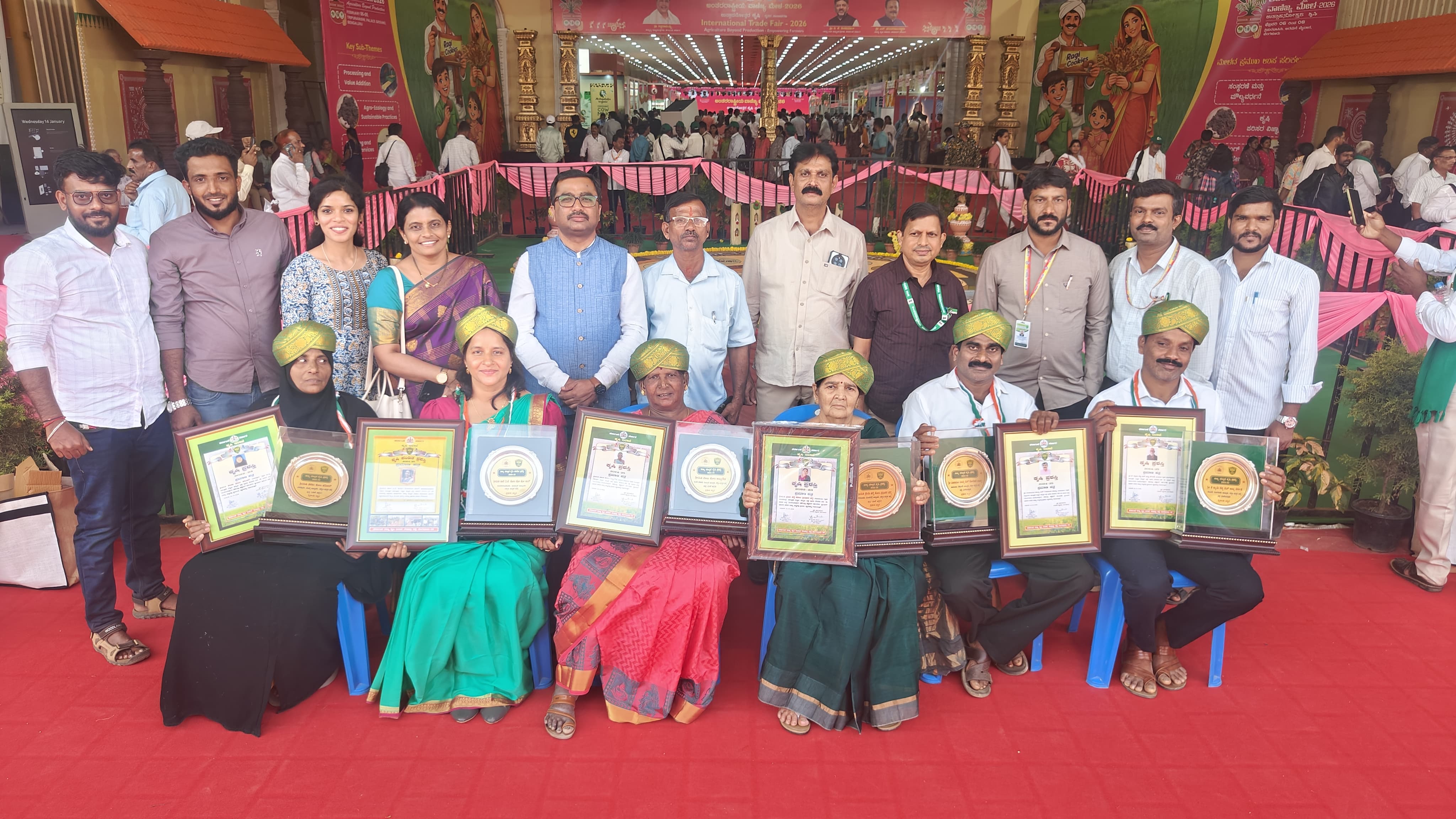ಮಂಗಳೂರು: ಬೆಂಗಳೂರಿನ ಅರಮನೆ ಮೈದಾನದಲ್ಲಿ ಕೃಷಿ ಇಲಾಖೆಯಿಂದ ನಡೆದ ಅಂತಾರಾಷ್ಟ್ರೀಯ ವಾಣಿಜ್ಯ ಮೇಳದಲ್ಲಿ ಮುಖ್ಯಮಂತ್ರಿ, ಕೃಷಿ ಸಚಿವರು ಹಾಗೂ ಇತರ ಗಣ್ಯರ ಸಮ್ಮುಖದಲ್ಲಿ ದಕ್ಷಿಣ ಕನ್ನಡ ಜಿಲ್ಲೆಯ ರಾಜ್ಯ ಮಟ್ಟದ ಕೃಷಿ ಪಂಡಿತ ಮತ್ತು ಕೃಷಿ ಪ್ರಶಸ್ತಿ ವಿಜೇತರನ್ನು ಸನ್ಮಾನಿಸಲಾಯಿತು.ಜಿಲ್ಲೆಯ ಮಂಗಳೂರು, ಬಂಟ್ವಾಳ ಮತ್ತು ಬೆಳ್ತಂಗಡಿ ತಾಲೂಕುಗಳಿಂದ ಆಯ್ಕೆಯಾದ ಒಟ್ಟು 6 ಮಂದಿ ಸಾಧಕ ರೈತರಿಗೆ ಗೌರವ ಪ್ರದಾನ ಮಾಡಲಾಯಿತು.