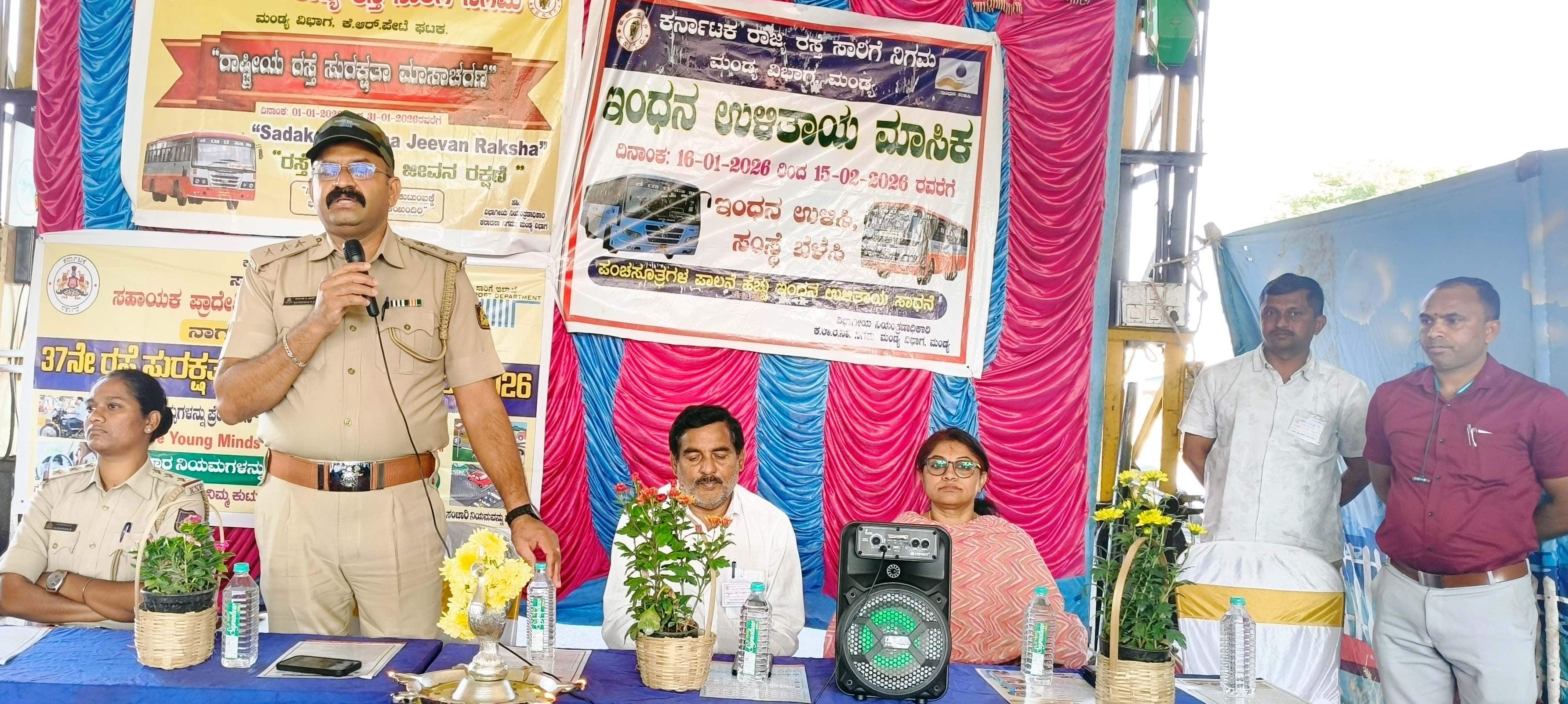 ಪಟ್ಟಣ ಪೊಲೀಸ್ ಠಾಣೆಯ ಆರಕ್ಷಕ ನಿರೀಕ್ಷಕಿ ಸುಮಾರಾಣಿ ರಸ್ತೆ ಸುರಕ್ಷತಾ ಮಾಸಾಚರಣೆ ಕಾರ್ಯಕ್ರಮವನ್ನು ಉದ್ಘಾಟಿಸಿದರು. ರಾಜ್ಯ ರಸ್ತೆ ಸಾರಿಗೆ ಇಲಾಖೆಯ ವಿಭಾಗೀಯ ಅಧಿಕಾರಿ ಚಿನ್ನ ಚುಂಚಯ್ಯ, ಕೆ.ಆರ್.ಪೇಟೆ ಬಸ್ ಡಿಪೋ ಮ್ಯಾನೇಜರ್ ಉಮಾ ಮಹೇಶ್ವರಿ ಇದ್ದರು.