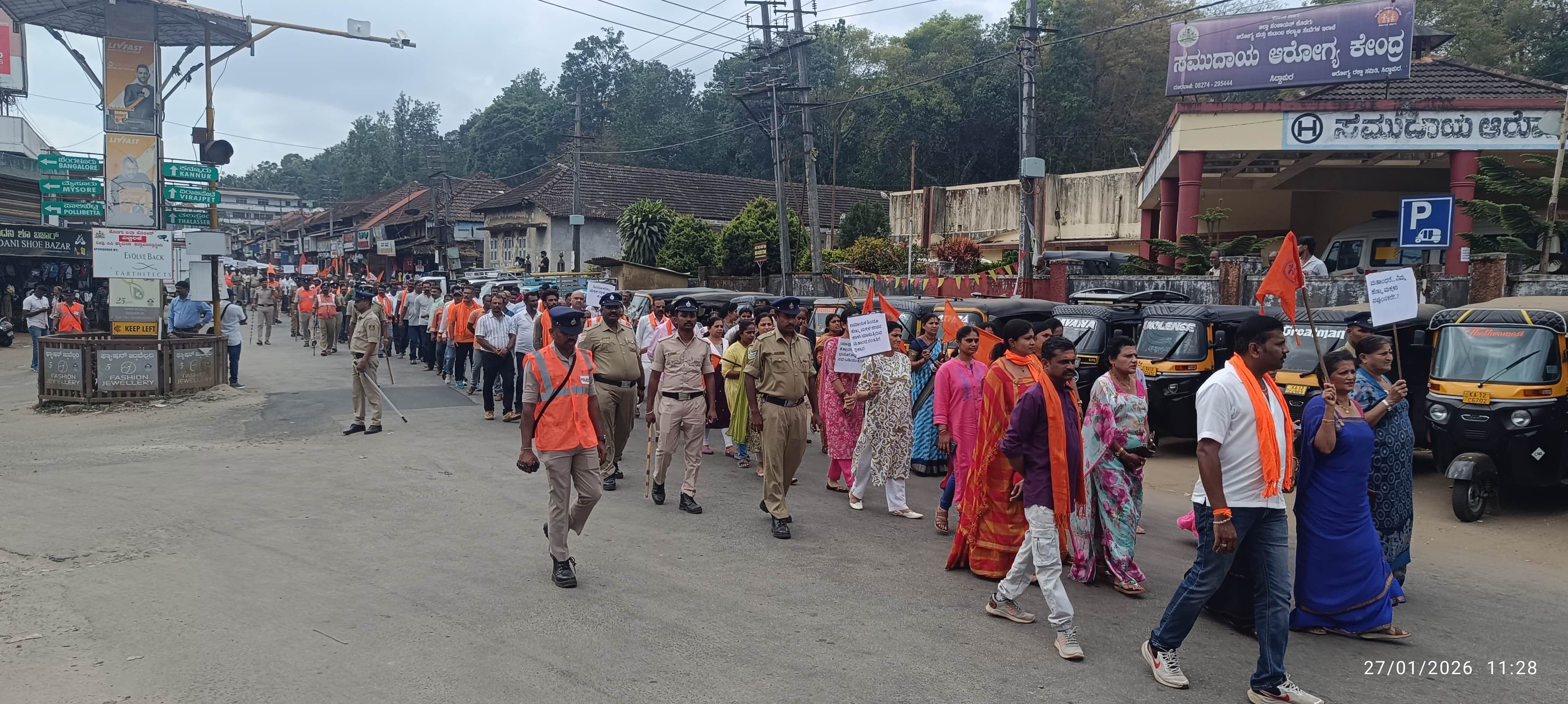 ಬುಡಕಟ್ಟು ಸಮಾಜದ ಮುಖ್ಯಸ್ಥ ಆರ್.ಕೆ. ಚಂದ್ರು, ಹಿಂದೂ ಜಾಗರಣ ವೇದಿಕೆ ಜಿಲ್ಲಾ ಸಂಚಾಲಕ ರಮೇಶ್ ಪುದಿಯಂಗಡ, ಕರ್ನಲ್ ಕನ್ನಂಡ ಉತ್ತಪ್ಪ ಇದ್ದರು.ಸಭೆಗೂ ಮುಂಚೆ ಸಿದ್ದಾಪುರದ ಅಯ್ಯಪ್ಪ ದೇವಾಲಯ ಮುಂಭಾಗದಿಂದ ಮೆರವಣಿಗೆ ಮೂಲಕ ಸಿದ್ದಾಪುರ ಬಸ್ ನಿಲ್ದಾಣಕ್ಕೆ ಆಗಮಿಸಿದ ಪ್ರತಿಭಟನಾಕಾರರು ಲವ ಜಿಹಾದ್ ನಡೆಸುವ ಮತಾಂಧ ಶಕ್ತಿಗಳ ವಿರುದ್ದ ಘೋಷಣೆ ಕೂಗಿದರು. ಜಿಲ್ಲೆಯ ವಿವಿಧ ಭಾಗಗಳಿಂದ ನೂರಾರು ಹಿಂದೂ ಕಾರ್ಯಕತ್ರರು ಸಭೆಗೆ ಆಗಮಿಸಿದ್ದು, ಜಿಲ್ಲಾ ಪೊಲೀಸರು