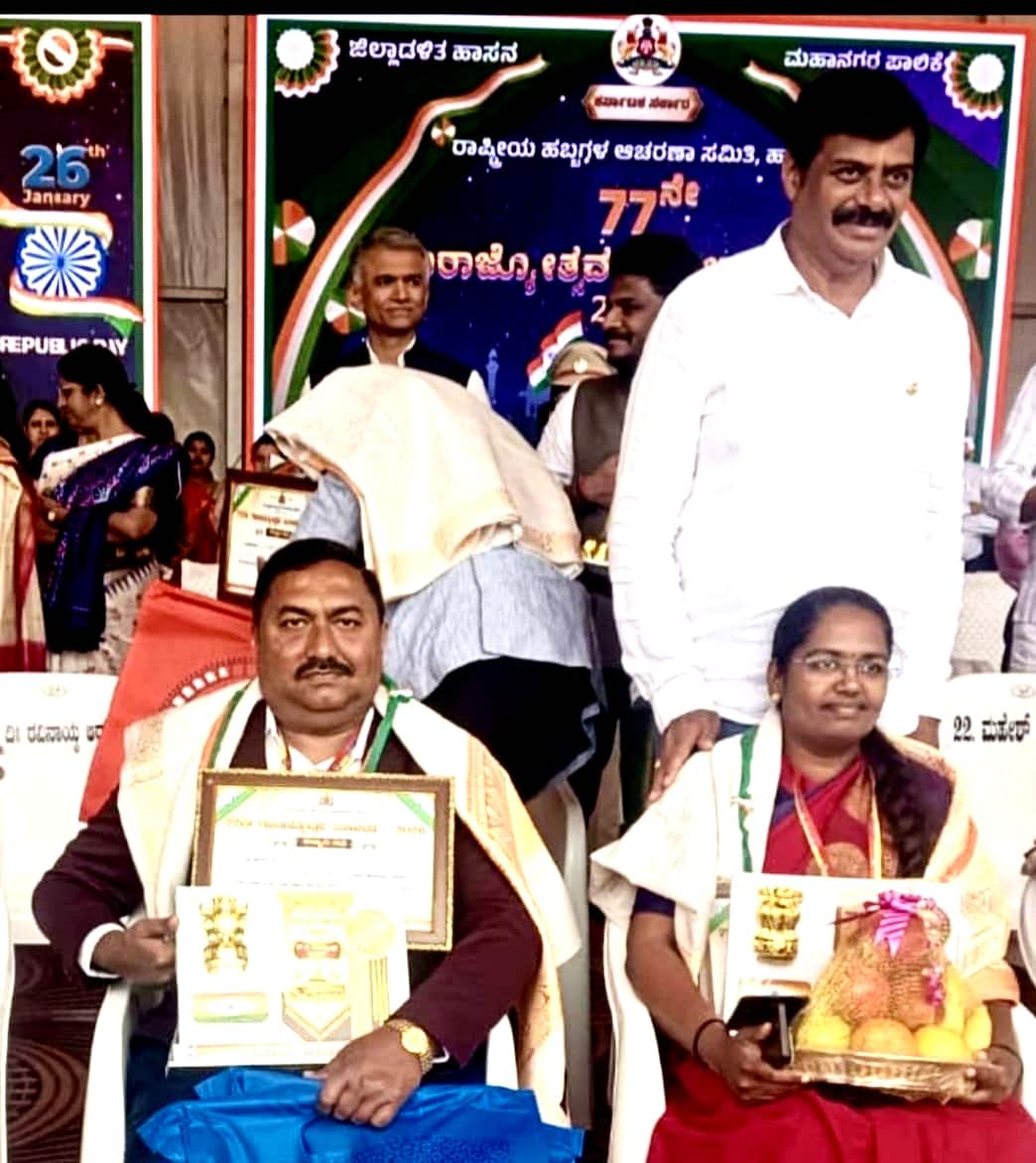 ಹಾಸನದ ಜಿಲ್ಲಾ ಹಾಕಿ ಕ್ರೀಡಾಂಗಣದಲ್ಲಿ ಜಿಲ್ಲಾ ರಾಷ್ಟ್ರೀಯ ಹಬ್ಬಗಳ ಆಚರಣೆ ಸಮಿತಿಯ ವತಿಯಿಂದ ಆಯೋಜಿಸಿದ್ದ, ೭೭ನೇ ಭಾರತದ ಗಣರಾಜ್ಯೋತ್ಸವ ಸಮಾರಂಭದಲ್ಲಿ, ಶಾಸಕ ಸ್ವರೂಪ್ ಪ್ರಕಾಶ್, ಜಿಲ್ಲಾ ಉಸ್ತುವಾರಿ ಸಚಿವ ಕೃಷ್ಣ ಬೈರೇಗೌಡ, ಸಂಸದ ಶ್ರೇಯಸ್ ಎಂ ಪಟೇಲ್, ಜಿಲ್ಲಾಧಿಕಾರಿ ಕೆ.ಎಸ್. ಲತಾಕುಮಾರಿ, ಜಿಪಂ ಸಿಇಒ ಬಿ.ಆರ್. ಪೂರ್ಣಿಮ, ಜಿಲ್ಲಾ ಪೊಲೀಸ್ ವರಿಷ್ಟಾಧಿಕಾರಿ ಶುಭನ್ವಿತ, ಕರ್ನಾಟಕ ರಾಜ್ಯ ಕಾರ್ಯನಿರತ ಪತ್ರಕರ್ತರ ಸಂಘದ ಉಪಾಧ್ಯಕ್ಷ ಎಚ್. ಬಿ. ಮದನಗೌಡ, ಜಿಲ್ಲಾ ಕಾರ್ಯನಿರತ ಪತ್ರಕರ್ತರ ಸಂಘದ ಅಧ್ಯಕ್ಷ ಜೆ.ಆರ್. ಕೆಂಚೇಗೌಡ ಸೇರಿದಂತೆ ಇನ್ನಿತರೆ ಗಣ್ಯರ ಉಪಸ್ಥಿತಿಯಲ್ಲಿ ಡಾ. ಜಗದೀಶ ಎಚ್.ಜಿ. ಅವರ ಆಯುಷ್ ವೈದ್ಯಕೀಯ ಕ್ಷೇತ್ರದಲ್ಲಿ ಸಲ್ಲಿಸಿದ ಸೇವೆಯನ್ನು ಪರಿಗಣಿಸಿ, ಸನ್ಮಾನಿಸಿ ಅಭಿನಂದಿಸಲಾಯಿತು.