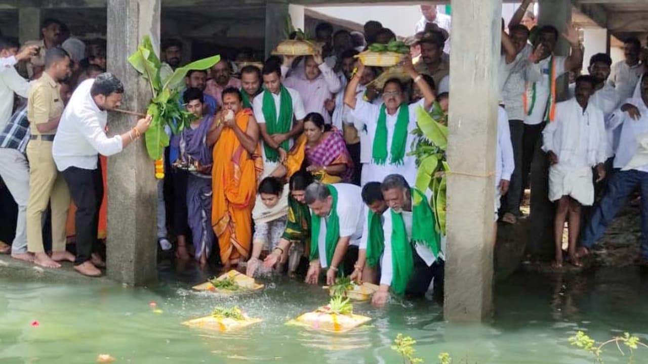 ಲಕ್ಕವಳ್ಳಿಯ ಭದ್ರಾ ಡ್ಯಾಂಗೆ ಸಚಿವ ಎಸ್.ಎಸ್.ಮಲ್ಲಿಕಾರ್ಜುನ, ಸಂಸದೆ ಡಾ.ಪ್ರಭಾ ಮಲ್ಲಿಕಾರ್ಜುನ ಸೇರಿದಂತೆ ಜನ ಪ್ರತಿನಿಧಿಗಳು, ರೈತರು, ಅಧಿಕಾರಿಗಳು, ಮುಖಂಡರು ಬಾಗಿನ ಅರ್ಪಿಸುತ್ತಿರುವುದು