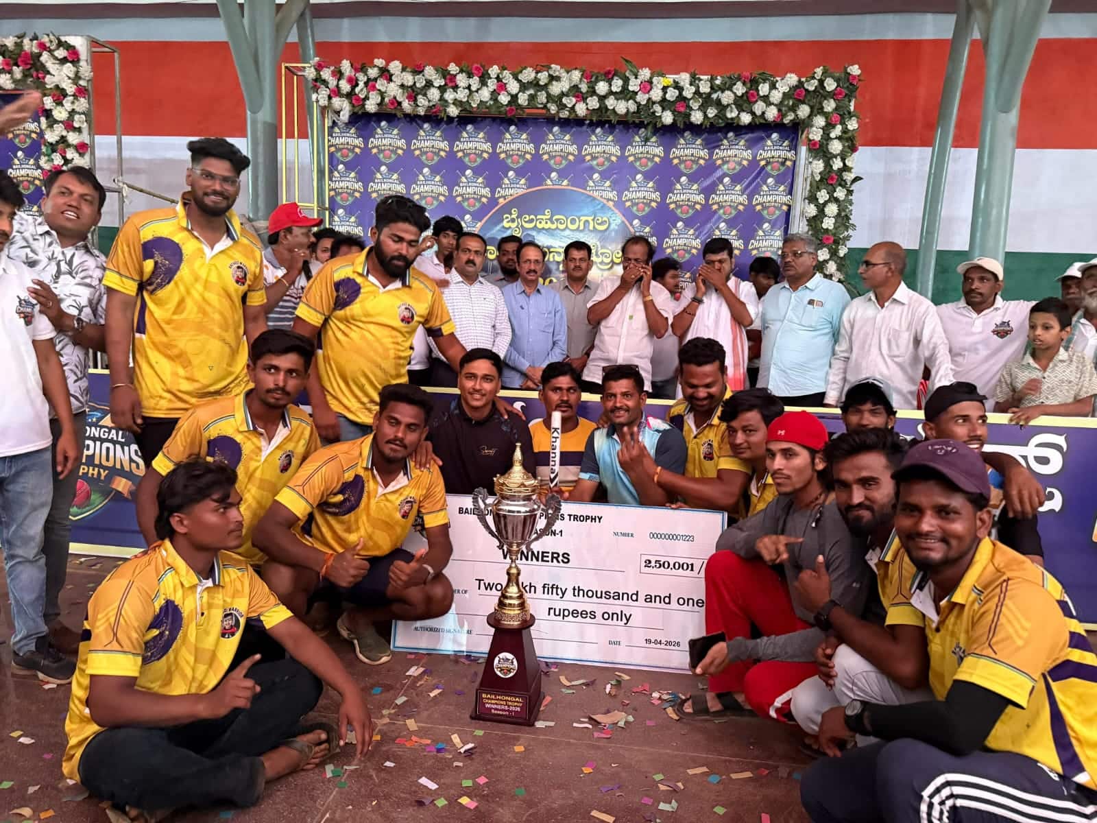 ನಗರಸಭೆ ಕ್ರೀಡಾಂಗಣದಲ್ಲಿ ನಡೆದ ಬೈಲಹೊಂಗಲ ಚಾಂಪಿಯನ್ಸ್ ಟ್ರೋಫಿ-2026 ಸೀಜನ್-1 ಕ್ರಿಕೆಟ್ ಟೂರ್ನಾಮೆಂಟ್ನ ಫೈನಲ್ ಪಂದ್ಯದಲ್ಲಿರೋಚಕ ಅಂತಿಮ ಹಣಾಹಣಿಯಲ್ಲಿ ಅದ್ಭುತ ಆಟವಾಡಿದ ಸವದತ್ತಿಯ ಅಗಸ್ತ್ಯ-11 ತಂಡ ಚಾಂಪಿಯನ್ ಪಟ್ಟ ತನ್ನ ಮುಡಿಗೇರಿಸಿಕೊಂಡಿತು. ಈ ಮೂಲಕ ಟೂರ್ನಿಯಲ್ಲಿ ವಿಜಯ ಪತಾಕೆ ಹಾರಿಸಿ ಒಟ್ಟು ₹2.50 ಲಕ್ಷ ನಗದು ಪ್ರಥಮ ಬಹುಮಾನವನ್ನು ಪಡೆದುಕೊಂಡಿತು. ಈ ವೇಳೆ ಶಾಸಕ ಮಹಾಂತೇಶ ಕೌಜಲಗಿ ವಿಜೇತ ತಂಡಗಳಿಗೆ ಬಹುಮಾನ ವಿತರಿಸಿದರು.