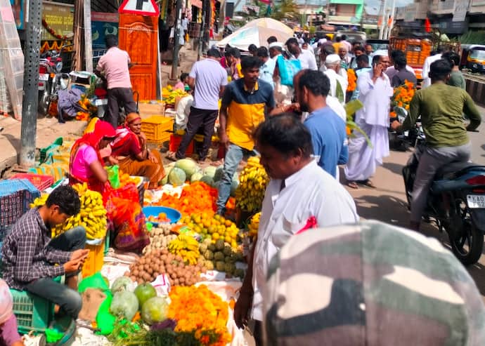 ಪಟ್ಟಣದ ಬಸವೇಶ್ವರ ವೃತ್ತ ಸೇರಿದಂತೆ ಮಾರುಕಟ್ಟೆ ಪ್ರದೇಶದಲ್ಲಿ ಹಬ್ಬದ ಖರೀದಿಯ ಭರಾಟೆ ಜೋರಾಗಿತ್ತು. ಮಾರುಕಟ್ಟೆಯಲ್ಲಿ ಪೂಜೆಗೆ ಅಗತ್ಯವಿರುವ ಚೆಂಡು ಹೂ, ಸೇವಂತಿಗೆ, ಬಾಳೆದಿಂಡು, ಕಬ್ಬು, ಸೇಬು, ಬಾಳೆಹಣ್ಣು , ಕಬ್ಬು, ಕುಂಬಳಕಾಯಿ ಸೇರಿದಂತೆ ವಿವಿಧ ಹಣ್ಣು-ಹಂಪಲಗಳ ಖರೀದಿಯಲ್ಲಿ ತೊಡಗಿದ್ದರು. ಚೆಂಡು ಹೂ ಪ್ರತಿ ಕೆಜಿಗೆ ₹ 70-120, ಸೇವಂತಿಗೆ ₹ 150-200 ಮಾರಾಟವಾಯಿತು. ವಿವಿಧ ಹಣ್ಣುಗಳ ದರ ಹೆಚ್ಚಳವಿತ್ತು. ಬೂದು ಕುಂಬಳಕಾಯಿ ₹ 50 ರಿಂದ 300, ಬಾಳೆ ಗಿಡ ಜೋಡಿಗೆ ₹ 30-1000 ರವರೆಗೂ ಮಾರಾಟವಾದವು. ಪಟ್ಟಣದ ಹೊರವಲಯದಲ್ಲಿ ಹಾಕಲಾಗಿದ್ದ ಅಂಗಡಿಗಳಲ್ಲಿ ಪಟಾಕ್ಷಿ ವ್ಯಾಪಾರವೂ ಜೋರಾಗಿತ್ತು.