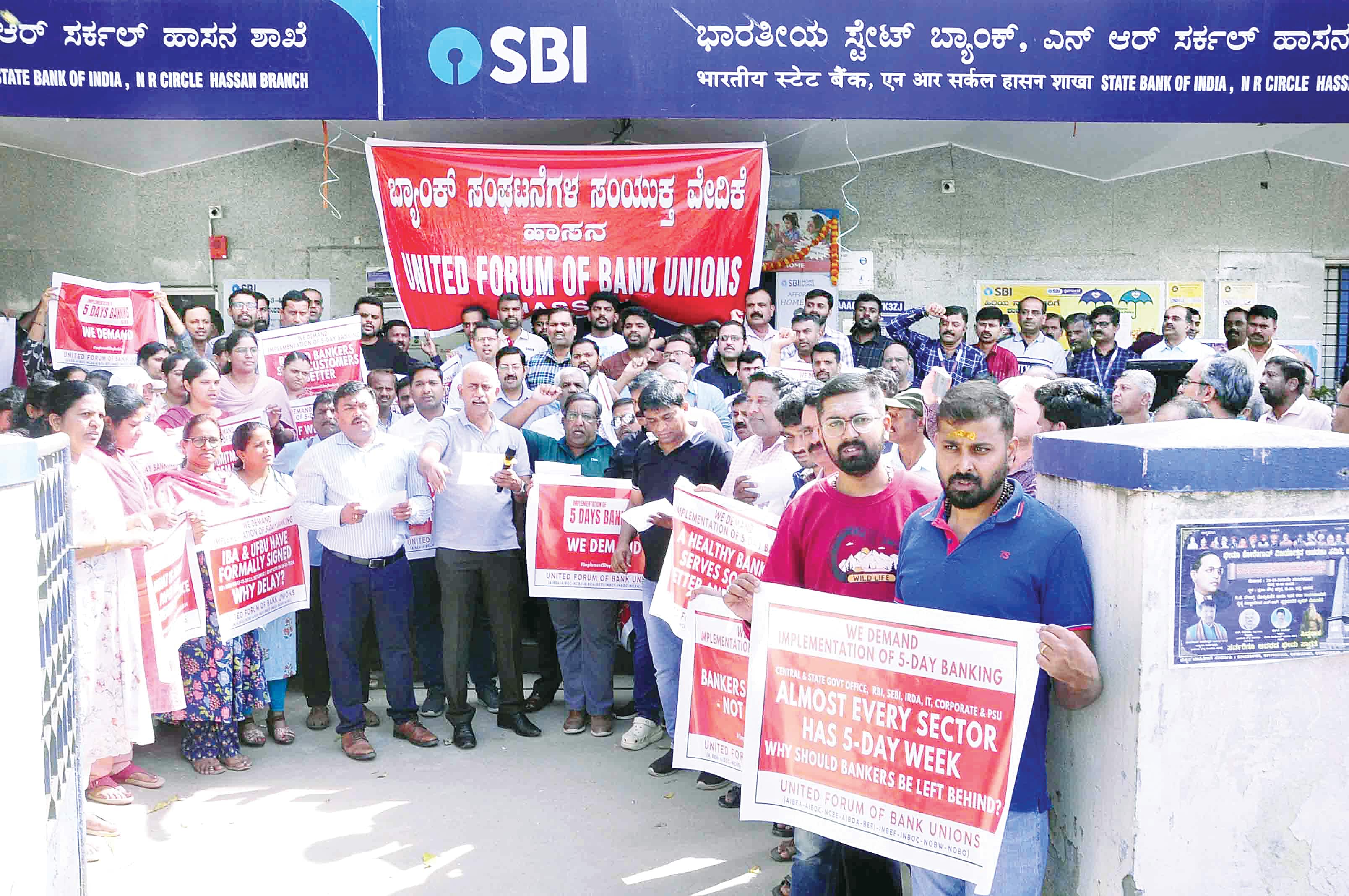 ವಾರದಲ್ಲಿ 5 ದಿನ ಮಾತ್ರ ಕೆಲಸ ನಿರ್ವಹಿಸಲು ಅವಕಾಶ ಕಲ್ಪಿಸಬೇಕೆಂದು ಆಗ್ರಹಿಸಿ ಸಾರ್ವಜನಿಕ ವಲಯದ ಬ್ಯಾಂಕ್ ಸಿಬ್ಬಂದಿ ಮಂಗಳವಾರ ಕರೆ ನೀಡಿದ್ದ ಅಖಿಲ ಭಾರತ ಮುಷ್ಕರಕ್ಕೆ ರಾಜ್ಯಾದ್ಯಂತ ಉತ್ತಮ ಪ್ರತಿಕ್ರಿಯೆ ವ್ಯಕ್ತವಾಗಿದ್ದು, ಬ್ಯಾಂಕ್ ವಹಿವಾಟು ಸಂಪೂರ್ಣ ಸ್ತಬ್ಧವಾಗಿತ್ತು.