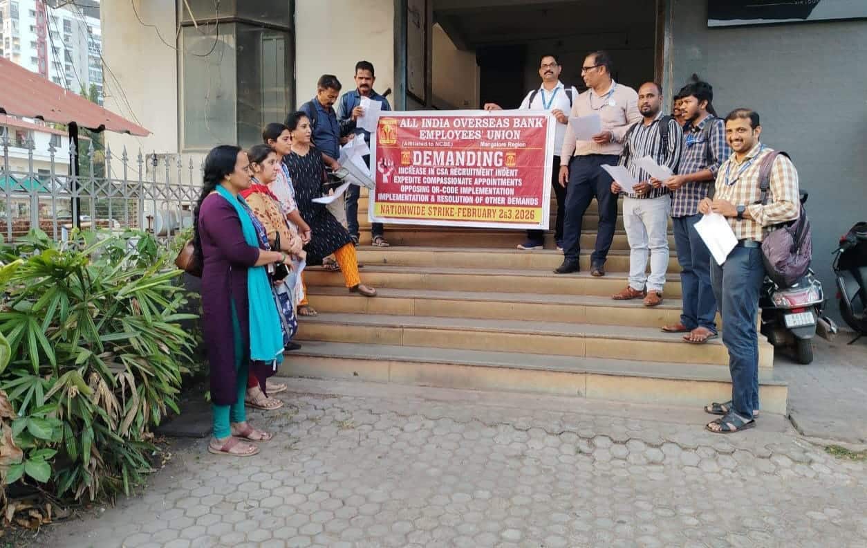 ಎಐಒಬಿಇಯು ಸಂಘಟನೆ ರಾಷ್ಟ್ರಾದ್ಯಂತ ಪ್ರತಿಭಟನೆ ನಡೆಸಿದ್ದು ಅದರ ಭಾಗವಾಗಿ ನೌಕರರ ಸಂಘದ ಎಜಿಎಸ್ ವಿನೋದ್ ಕುಮಾರ್ ಮತ್ತು ಆರ್ಸಿಎಂ ಜನಾರ್ದನ ಅವರು ತಮ್ಮ ಸಹೋದ್ಯೋಗಿಗಳೊಂದಿಗೆ ಇಂಡಿಯನ್ ಓವರ್ಸೀಸ್ ಬ್ಯಾಂಕಿನ ಮಂಗಳೂರು ಪ್ರಾದೇಶಿಕ ಕಚೇರಿ ಬಳಿ ಪ್ರತಿಭಟನೆ