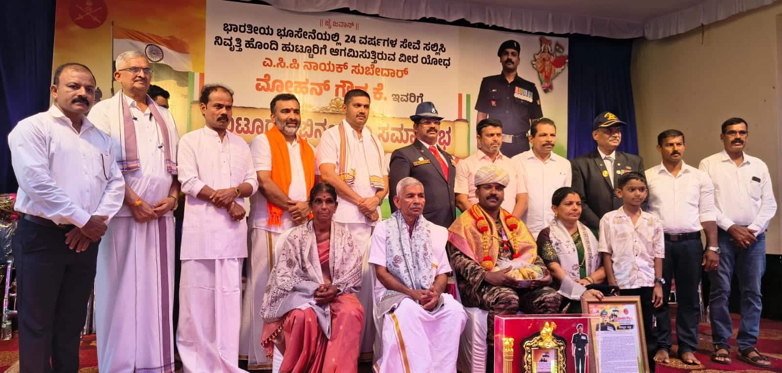 ಬೆಳ್ತಂಗಡಿ: ಭಾರತ ದೇಶದ ರಕ್ಷಣಾ ವಿಭಾಗದ ಭೂ ಸೇನೆಯಲ್ಲಿ 24 ವರ್ಷ ಸೇವೆ ಸಲ್ಲಿಸಿ ನಿವೃತ್ತಿ ಹೊಂದಿ ಹುಟ್ಟೂರಿಗೆ ಆಗಮಿಸಿದ ಬೆಳಾಲು ಗ್ರಾಮದ ಕಾಡಂಡ ನಿವಾಸಿ ವೀರ ಯೋಧ ಎಸಿಪಿ ನಾಯಕ ಸುಬೇದಾರ್ ಮೋಹನ ಗೌಡ ಅವರಿಗೆ ಬೆಳಾಲು ಗ್ರಾಮದ ಸಂಘ ಸಂಸ್ಥೆಗಳು, ಊರವರ ಸಹಕಾರದಲ್ಲಿ ಅಭಿನಂದನಾ ಸಮಿತಿ ವತಿಯಿಂದ ಭಾನುವಾರ ಹುಟ್ಟೂರ ಅಭಿನಂದನಾ ಸಮಾರಂಭ ಬೆಳಾಲು ಎಸ್ ಡಿಎಂ ಪ್ರೌಢಶಾಲೆಯಲ್ಲಿ ನಡೆಯಿತು.