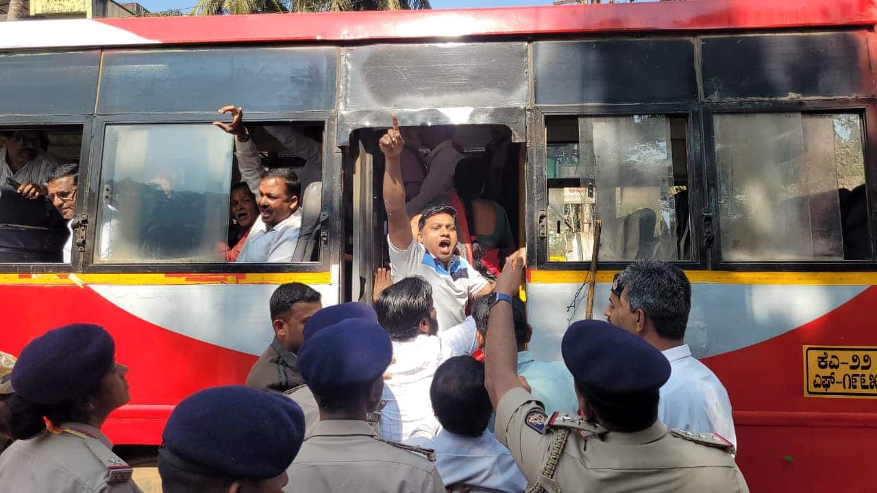 ಇದೇ ವೇಳೆ, ಮಹಾಮೇಳಾವ್ಗೆ ಅನುಮತಿ ನೀಡದ್ದನ್ನು ಖಂಡಿಸಿ ಮಹಾರಾಷ್ಟ್ರದ ಕೊಲ್ಲಾಪುರ ಸೆಂಟ್ರಲ್ ಬಸ್ ನಿಲ್ದಾಣದಲ್ಲಿ ಶಿವಸೇನೆಯ (ಉದ್ಧವ್ ಠಾಕ್ರೆ ಬಣ) ಕಾರ್ಯಕರ್ತರು ಪುಣೆಯಿಂದ ಹಳಿಯಾಳಕ್ಕೆ ಬರುತ್ತಿದ್ದ ಕರ್ನಾಟಕ ರಾಜ್ಯ ರಸ್ತೆ ಸಾರಿಗೆ ಸಂಸ್ಥೆಗೆ ಸೇರಿದ ಬಸ್ ತಡೆದು, ಅದರ ಮೇಲೆ ಜೈ ಮಹಾರಾಷ್ಟ್ರ ಸ್ಟಿಕ್ಕರ್ ಅಂಟಿಸಿ, ಜೈ ಮಹಾರಾಷ್ಟ್ರ ಘೋಷಣೆ ಕೂಗಿ ಉದ್ದಟತನ ತೋರಿದರು.ಎಂಇಎಸ್ ವಿರುದ್ಧ ಕರವೇ ಪ್ರತಿಭಟನೆ:ಈ ಮಧ್ಯೆ, ಮಹಾಮೇಳಾವ್ ಖಂಡಿಸಿ ಕರವೇ (ನಾರಾಯಣಗೌಡ ಬಣ) ಜಿಲ್ಲಾಧ್ಯಕ್ಷ ದೀಪಕ ಗುಡಗನಟ್ಟಿ, ರಾಜ್ಯ ಸಂಚಾಲಕ ಸುರೇಶ ಗವನ್ನವರ ಸೇರಿ ಸಂಘಟನೆಯ ಹಲವು ಕಾರ್ಯಕರ್ತರು ವ್ಯಾಕ್ಸಿನ್ ಡಿಪೋದತ್ತ ತೆರಳಿದಾಗ, ಪೊಲೀಸರು ಅವರನ್ನು ತಡೆದು, ವಶಕ್ಕೆ ಪಡೆದರು. ಈ ವೇಳೆ ಪ್ರತಿಭಟನಾಕಾರರು ಎಂಇಎಸ್ ವಿರುದ್ಧ ಘೋಷಣೆ ಕೂಗಿ ಆಕ್ರೋಶ ವ್ಯಕ್ತಪಡಿಸಿದರು.