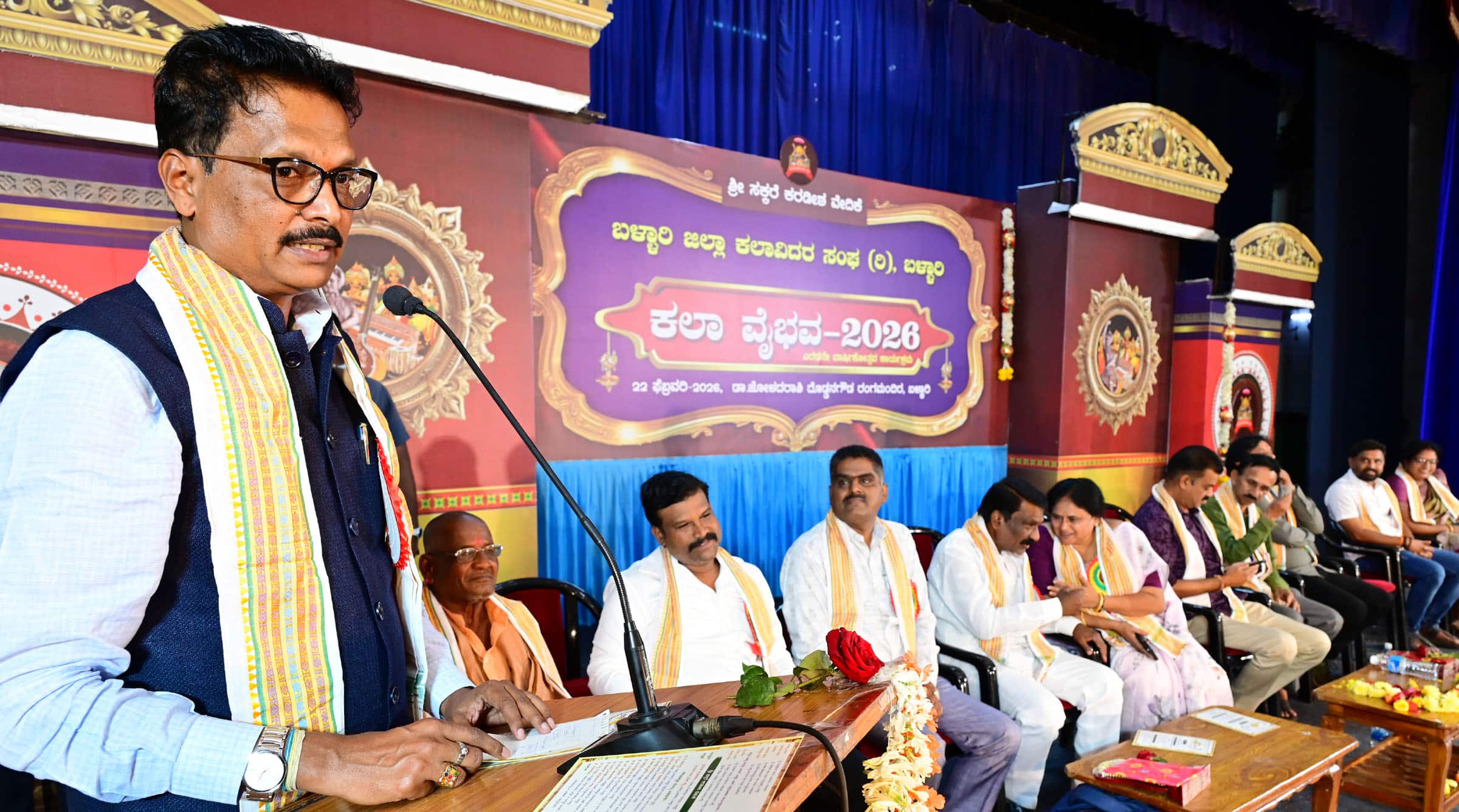 ಇಲ್ಲಿನ ಡಾ.ಜೋಳದರಾಶಿ ದೊಡ್ಡನಗೌಡ ರಂಗಮಂದಿರದಲ್ಲಿ ಭಾನುವಾರ ಬಳ್ಳಾರಿ ಜಿಲ್ಲಾ ಕಲಾವಿದರ ಸಂಘ ಹಮ್ಮಿಕೊಂಡಿದ್ದ ಕಲಾವೈಭವ-2026 ಕಾರ್ಯಕ್ರಮಕ್ಕೆ ಚಾಲನೆ ನೀಡಿ ಅವರು ಮಾತನಾಡಿದರು.ಹಂಪಿ ಉತ್ಸವದಲ್ಲಿ ಬಳ್ಳಾರಿ ಜಿಲ್ಲೆಯ ಕಲಾವಿದರಿಗೆ ಅವಕಾಶ ಸಿಕ್ಕಿಲ್ಲ. ವಿಜಯನಗರ ಜಿಲ್ಲೆ ಪ್ರತ್ಯೇಕವಾದ ಬಳಿಕ ಈ ಭಾಗದ ಕಲಾವಿದರಿಗೆ ಅನ್ಯಾಯವಾಗಿದೆ ಎಂಬ ಮಾತುಗಳು ಕೇಳಿ ಬಂದಿವೆ. ಕಲಾವಿದರಿಗೆ ಅನ್ಯಾಯವಾಗಲು ಬಿಡುವುದಿಲ್ಲ. ಬಳ್ಳಾರಿ ಉತ್ಸವ ಅದ್ಧೂರಿ ಹಾಗೂ ಅರ್ಥಪೂರ್ಣವಾಗಿ ಮಾಡೋಣ. ಜಿಲ್ಲೆಯ ಯಾವುದೇ ಉತ್ಸವಗಳು ಡಿಸೆಂಬರ್ ಒಳಗೆ ಮುಗಿಸಬೇಕು. ಮಾರ್ಚ್ ನಲ್ಲಿ ಪರೀಕ್ಷೆಗಳು ಇರುವುದರಿಂದ ವಿದ್ಯಾರ್ಥಿಗಳಿಗೆ ತೊಂದರೆಯಾಗಲಿದೆ. ರಾಜ್ಯಕ್ಕೆ ಮಾದರಿಯಾಗುವಂತೆ ಬಳ್ಳಾರಿಯಲ್ಲಿ ಅಖಿಲ ಭಾರತ ಕನ್ನಡ ಸಾಹಿತ್ಯ ಸಮ್ಮೇಳನ ನಡೆಸಲಾಗುವುದು ಎಂದು ತಿಳಿಸಿದರು.