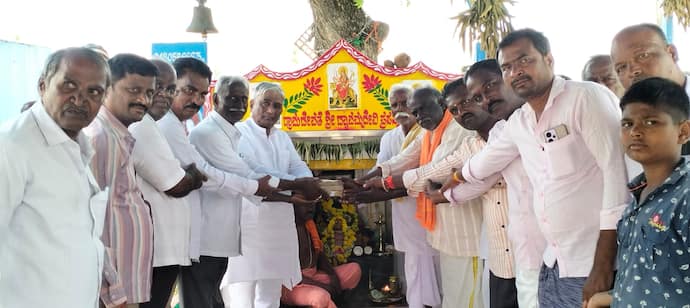 ಕಾರಟಗಿ: ಪಟ್ಟಣದಲ್ಲಿ ಗ್ರಾಮದೇವತೆ ದ್ಯಾವಮ್ಮದೇವಿ ದೇವಸ್ಥಾನ ನಿರ್ಮಾಣ ಕಾರ್ಯಕ್ಕೆ ಇಲ್ಲಿನ ಭಜಂತ್ರಿ ಸಮಾಜದಿಂದ ಸಂಗ್ರಹಿಸಲಾದ ₹೧.೨೮ ಲಕ್ಷ ವಂತಿಗೆಯನ್ನು ಯೋಜನೆಯ ಉಸ್ತುವಾರಿ, ಮಾಜಿ ಸಚಿವ ನಾಗಪ್ಪ ಸಾಲೋಣಿ ಅವರಿಗೆ ಸಮಾಜದ ಮುಖ್ಯಸ್ಥರು ಹಸ್ತಾಂತರಿಸಿದರು.