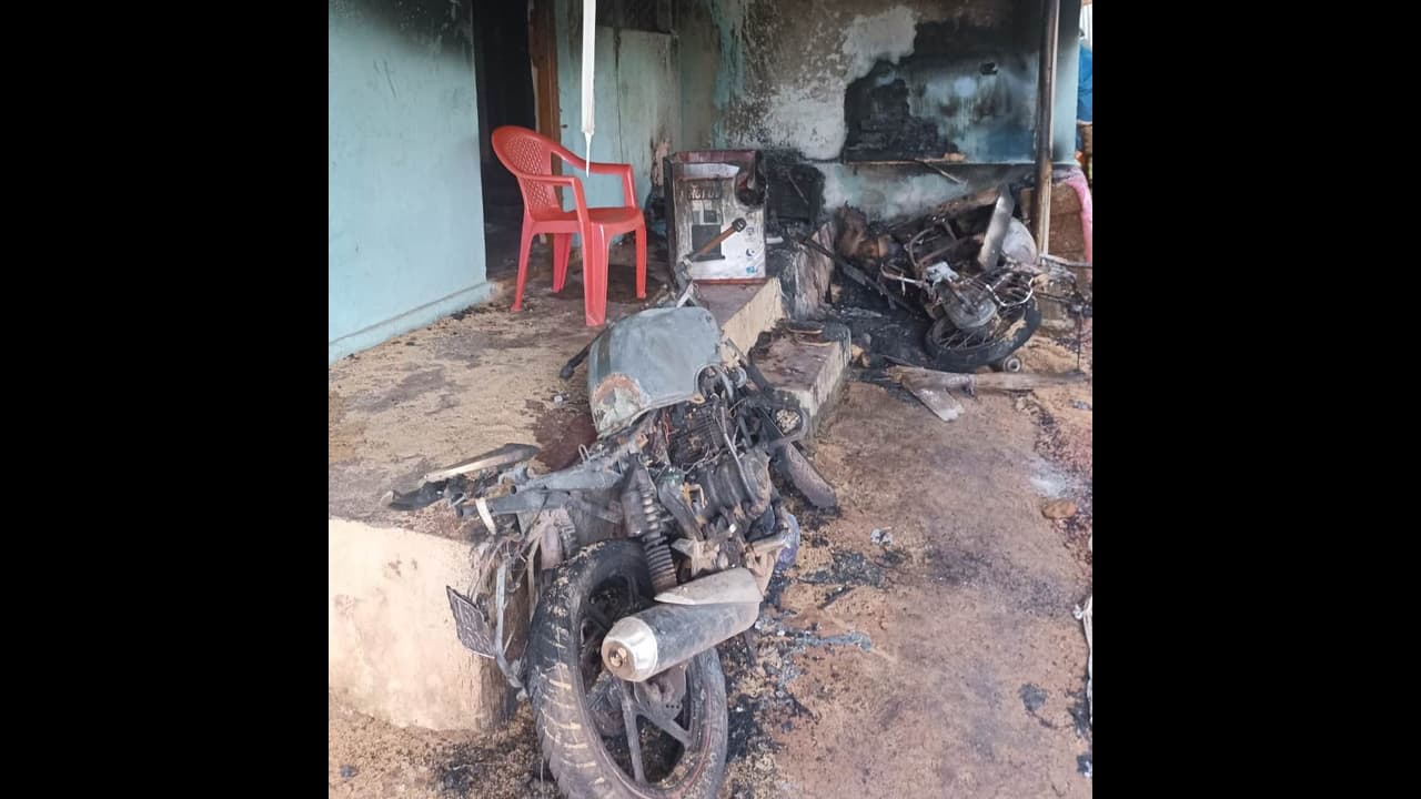 ಭಟ್ಕಳ: ಪುರವರ್ಗದ ಮುಗಳಿಹೊಂಡದ ಮನೆಯೊಂದರ ಅಂಗಳದಲ್ಲಿ ನಿಲ್ಲಿಸಿದ್ದ ಎರಡು ಬೈಕುಗಳಿಗೆ ಬೆಂಕಿ ಹಚ್ಚಿ ಬೈಕುಗಳನ್ನು ಸಂಪೂರ್ಣ ಸುಟ್ಟಿರುವ ಘಟನೆ ಗುರುವಾರ ತಡರಾತ್ರಿ ನಡೆದಿದೆ.