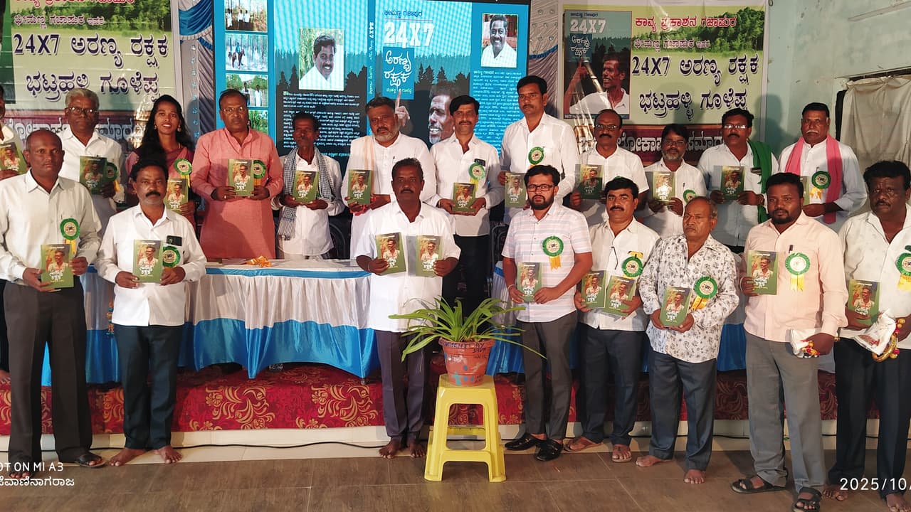 ಅವರು ಪಟ್ಟಣದ ಜ್ಞಾನಭಾರತಿ ಬಿ.ಇಡಿ ಕಾಲೇಜ್ ಸಭಾಂಗಣದಲ್ಲಿ ಗಜಾಪುರದ ಕಾವ್ಯ ಪ್ರಕಾಶನದಿಂದ ಆಯೋಜಿಸಿದ್ದ ಭೀಮಣ್ಣ ಗಜಾಪುರ ರಚನೆಯ 24*7 ಅರಣ್ಯ ರಕ್ಷಕ ಭಟ್ರಹಳ್ಳಿ ಗೂಳೆಪ್ಪ ಎನ್ನುವ ಪುಸ್ತಕದ ಲೋಕಾರ್ಪಣೆಗೊಳಿಸಿ ಮಾತನಾಡಿದರು.ಯಾವುದೇ ಫಲಾಪೇಕ್ಷೆ ಇಲ್ಲದೇ ಇಂದು ನೂರಾರು ಎಕರೆಯಲ್ಲಿ ಗಿಡ-ಮರ ಬೆಳೆಸಿದ ಗೂಳೆಪ್ಪ ಅರಣ್ಯ ಇಲಾಖೆ ಮಾಡುವ ಕೆಲಸವನ್ನು ತಾನು ಮಾಡಿ ಅರಣ್ಯ ಉಳಿಸಿದ ಧೀಮಂತ ವ್ಯಕ್ತಿ. ಸದ್ದಿಲ್ಲದೆ ಕೂಡ್ಲಿಗಿ ಅರಣ್ಯ ವ್ಯಾಪ್ತಿಯಲ್ಲಿನ 125 ಎಕರೆ ಅರಣ್ಯದಲ್ಲಿ ಗಿಡ ನೆಟ್ಟು ಪೋಷಣೆ ಮಾಡಿದ ನಿರ್ಮೋಹಿ ಭಟ್ರಳ್ಳಿ ಗೂಳೆಪ್ಪ ಎಂದು ಬಣ್ಣಿಸಿದರು.
