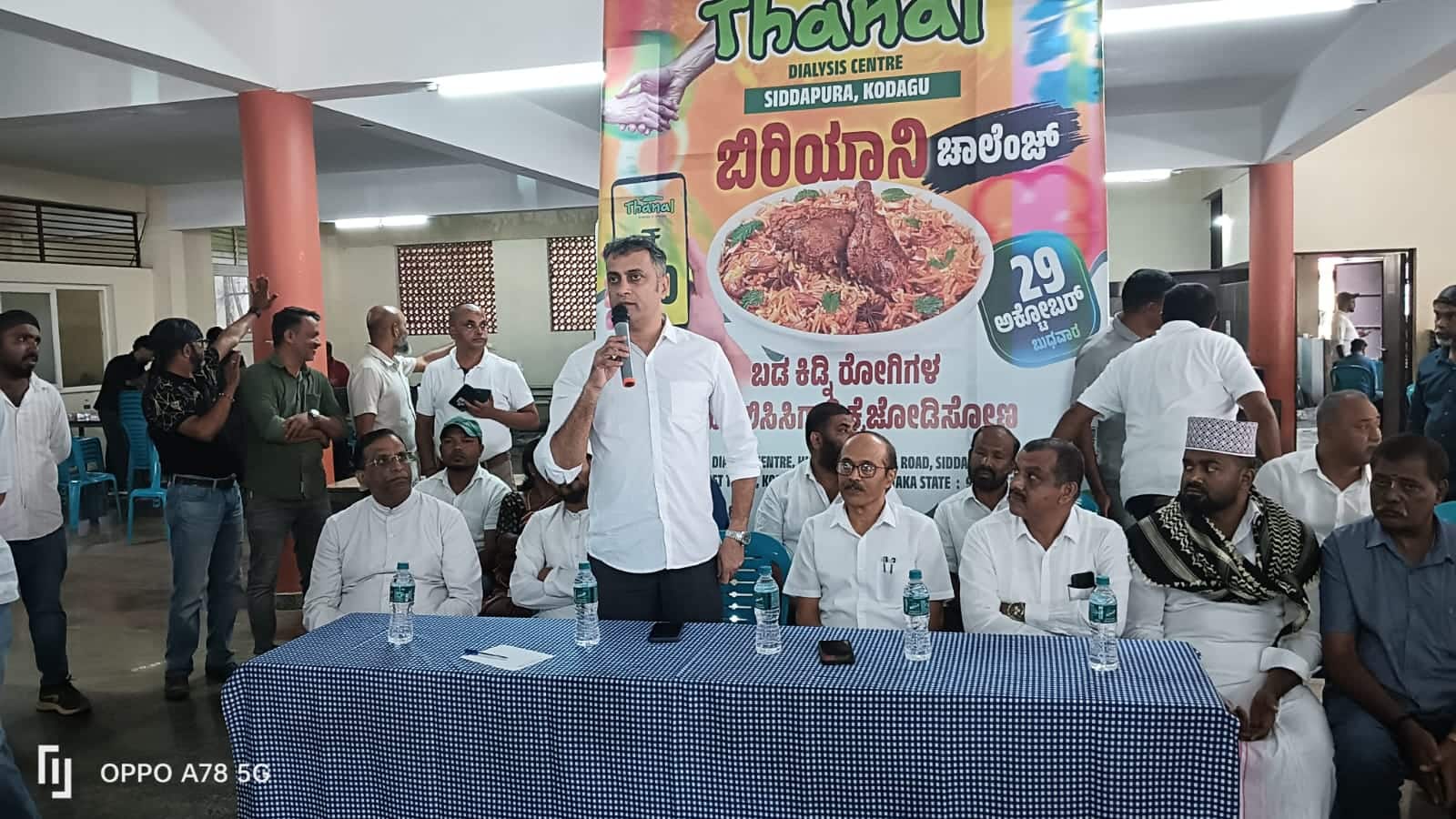 ಸಿದ್ದಾಪುರದ ತಣಲ್ ಸಂಸ್ಥೆಯು ಬಡ ಕಿಡ್ನಿ ರೋಗಿಗಳ ಡಯಾಲಿಸಿಸ್ ಗೆ ನೆರವಾಗಲು ನೆಲ್ಲಿಹುದಿಕೇರಿಯ ಶಾದಿ ಮಹಲ್ ಸಭಾಂಗಣದಲ್ಲಿ ಆಯೋಜಿಸಿದ್ದ ಬಿರಿಯಾನಿ ಚಾಲೆಂಜ್ ಕಾರ್ಯಕ್ರಮವನ್ನು ಮುಖ್ಯಮಂತ್ರಿಗಳ ಕಾನೂನು ಸಲಹೆಗಾರ ಹಾಗೂ ವಿರಾಜಪೇಟೆ ಕ್ಷೇತ್ರದ ಶಾಸಕ ಎ.ಎಸ್.ಪೊನ್ನಣ್ಣ ಉದ್ಘಾಟಿಸಿದರು.ನಂತರ ಮಾತನಾಡಿದ ಶಾಸಕರು, ಹಲವಾರು ಸಾಮಾಜಿಕ ಹಾಗೂ ಶೈಕ್ಷಣಿಕ ಚಟುವಟಿಕೆಗಳಿಗೆ ಪ್ರೋತ್ಸಾಹ ನೀಡುತ್ತಿರುವ ತಣಲ್ ಸಂಸ್ಥೆಯ ಕಾರ್ಯವೈಖರಿ ಎಲ್ಲರಿಗೂ ಮಾದರಿ ಹಾಗೂ ಶ್ಲಾಘನೀಯ ಎಂದರು.