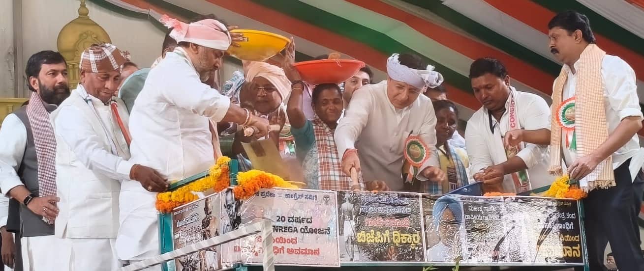 ದೇಶದಲ್ಲಿನ ಕೋಟ್ಯಾಂತರ ಜನ ದಿನ ಕೂಲಿ ಮಾಡಿ ಜೀವನ ನಡೆಸುತ್ತಿದ್ದಾರೆ. ಮನರೇಗಾ ಯೋಜನೆ ಕೈಬಿಟ್ಟು ವಿಬಿ ಜಿ ರಾಮ್ ಜಿ ತಂದು ಬಿಜೆಪಿ, ಜೆಡಿಎಸ್ ಪಕ್ಷಗಳು ಕಾಂಗ್ರೆಸ್ ಮೇಲೆ ಹಲ್ಲೆ ಮಾಡಿಲ್ಲ. ಬದಲಾಗಿ ಮನರೇಗಾವನ್ನು ವಿಬಿ ಜಿ ರಾಮ್ ಜಿಗೆ ಬದಲಾಯಿಸಲು ಬಿಜೆಪಿ ಮತ್ತು ಜೆಡಿಎಸ್ ಸೇರಿಕೊಂಡು ಕುತಂತ್ರ ಮಾಡಿ ಶ್ರಮಿಕರ, ರೈತರ, ಬಡಜನರ ಹೊಟ್ಟೆ ಪಾಡಿನ ಮೇಲೆ ಹಲ್ಲೆ ಮಾಡಿದೆ ಎಂದು ಎಐಸಿಸಿ ಪ್ರಧಾನ ಕಾರ್ಯದರ್ಶಿ ರಣ್ದೀಪ್ ಸಿಂಗ್ ಸುರ್ಜೇವಾಲ ಆರೋಪಿಸಿದರು.ನಗರ ಹೊರವಲಯದ ರಾಷ್ಟ್ರೀಯ ಹೆದ್ದಾರಿ 44ರ ಅಗಲಗುರ್ಕಿ ಸಮೀಪದ ವೇದಿಕೆಯಲ್ಲಿ ಸೋಮವಾರ ನಡೆದ ಅಖಿಲ ಭಾರತ ಮಟ್ಟದ ನರೇಗಾ ಬಜಾವ್ ಆಂದೋಲನ ಕಾರ್ಯಕ್ರಮಕ್ಕೆ ಸನಿಕೆಯಿಂದ ಮಣ್ಣು ಎತ್ತಿ ಬಾಣಲೆಗೆ ಸುರಿದು ತಲೆಯ ಮೇಲೆ ಹೊರುವ ಮೂಲಕ ಚಾಲನೆ ನೀಡಿ ಮಾತನಾಡಿ, ಈ ವಿಚಾರದಲ್ಲಿ ದೇಶದ ಜನರಿಗೆ ಉದ್ಯೋಗಕ್ಕೆ ಸಹಾಯವಾಗಲಿ ಎಂದು ಈ ಯೋಜನೆಯನ್ನು ಮನಮೋಹನ್ ಸಿಂಗ್ ಮೂಲಕ ಸೋನಿಯಾ ಗಾಂಧಿ ಆರಂಭಿಸಿದರು ಎಂದರು.ಈ ಹೊಸ ಕಾನೂನು ಬಿಜೆಪಿ ಚಾಲ್ತಿಗೆ ತಂದಾಗ ಅವರ ಮನಸ್ಥಿತಿ ಹೇಗಿದೆ ಅಂತ ಅರ್ಥ ಆಯ್ತು, ಅವರಿಗೆ ಬಡವರು ಅನುಕೂಲವಾಗಿರೋದು ಇಷ್ಟ ಇಲ್ಲ. ಆದರೆ ಕಾಂಗ್ರೆಸ್ ಮನಸ್ಥಿತಿ ಬೇರೆಯೇ ಇದೆ. ಹಿಂದುಳಿದವರು, ಪರಿಶಿಷ್ಟರ, ಬಡವರು ಎಲ್ಲರಗೂ ನ್ಯಾಯ ಕೊಡಬೇಕು ಅನ್ನೋದು ಕಾಂಗ್ರೆಸ್ ಯೋಜನೆ. ಬಿಜೆಪಿ ಜೆಡಿಎಸ್ ಸೇರಿ ಗಾಂಧಿ ಅವರ ಹೆಸರನ್ನು ಯಾಕೆ ತೆಗೆದಿದ್ದಾರೆ ಅಂತ ದೇಶದ ದುಡಿಯುವ ಜನತೆ ಪ್ರಶ್ನೆ ಮಾಡಬೇಕು. 11 ಕೋಟಿ ಜನ ನರೇಗಾದಡಿ ದುಡಿಯುತ್ತಿದ್ದಾರೆ. 55 ಕೋಟಿ ಜನರು ಇದರ ಮೇಲೆ ಅವಲಂಬಿತರಾಗಿದ್ದಾರೆ. ಅವರ ಹೊಟ್ಟೆ ಮೇಲೆ ಯಾಕೆ ಹೊಡೆಯುತ್ತಿದ್ದಾರೆ, ಅನ್ನವನ್ನು ಯಾಕೆ ಕಿತ್ತುಕೊಳ್ತಿದ್ದಾರೆ ಅಂತ ಪ್ರಶ್ನೆ ಮಾಡಬೇಕು ಎಂದರು.