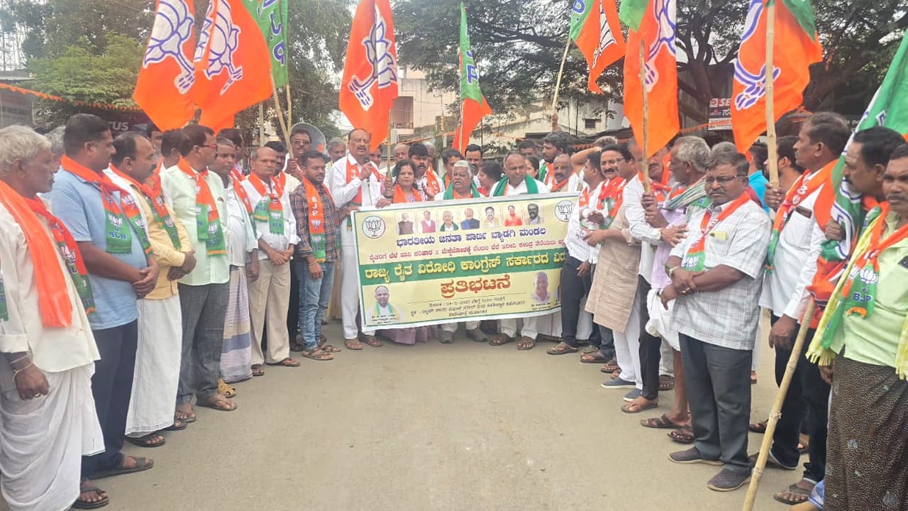 100 ಕ್ವಿಂಟಲ್ ಖರೀದಿಸಿ: ಕೇಂದ್ರ ಸರ್ಕಾರ ಈಗಾಗಲೇ ₹ 2400ಗಳಿಗೆ ಬೆಂಬಲ ಬೆಲೆ ಘೋಷಣೆ ಮಾಡಿದೆ. ರೈತರ ಬೆಳೆಗಳಿಗೆ ಸೂಕ್ತ ಬೆಂಬಲ ಬೆಲೆ ನೀಡದೆ, ಮೆಕ್ಕೆಜೋಳ ಖರೀದಿ ಕೇಂದ್ರ ಆರಂಭಿಸಲು ಮೀನ ಮೇಷ ಎಣಿಸುತ್ತಿದ್ದು, ಕೂಡಲೇ ಖರೀದಿ ಕೇಂದ್ರ ಆರಂಭಿಸಬೇಕು. ಪ್ರತಿ ರೈತರು ಬೆಳೆದಂತಹ 100 ಕ್ವಿಂಟಲ್ ಗೋವಿನಜೋಳ ಖರೀದಿಸುವಂತೆ ಆಗ್ರಹಿಸಿದರು.ರೈತ ವಿರೋಧಿ ಸರಕಾರ: ಬಸವರಾಜ ಛತ್ರದ ಮಾತನಾಡಿ, ಬಿಜೆಪಿ ಅವಧಿಯಲ್ಲಿ ರೈತರ ಶ್ರೇಯೋಭಿವೃದ್ಧಿಗೆ ಜಾರಿಗೆ ತರಲಾಗಿದ್ದ ರೈತ ವಿದ್ಯಾನಿಧಿ, ಕಿಸಾನ್ ಸಮ್ಮಾನ ಯೋಜನೆ, ಡೀಸೆಲ್ ಸಬ್ಸಿಡಿ ಸೇರಿದಂತೆ ಎಲ್ಲ ಯೋಜನೆಗಳಿಗೆ ಕಾಂಗ್ರೆಸ್ ಸರ್ಕಾರ ಬ್ರೇಕ್ ಹಾಕಿದೆ. ಇದರೊಟ್ಟಿಗೆ ತುಂತುರು ನೀರಾವರಿ ಪರಿಕರ ದರ ಹೆಚ್ಚಳ, ಟಿಸಿ ದುಬಾರಿ, ಸ್ಟ್ಯಾಂಪ್ ಬೆಲೆ ಹೆಚ್ಚಳ ಮಾಡಿ ರೈತರ ಬದುಕನ್ನು ದುಸ್ತರವಾಗಿಸಿದೆ ಎಂದರು.