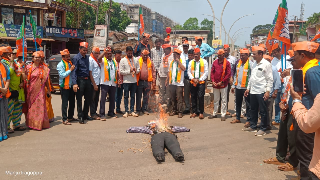 ಬಿಜೆಪಿ ಜಿಲ್ಲಾ ಪ್ರಧಾನ ಕಾರ್ಯದರ್ಶಿ ಗುರುಪ್ರಸಾದ ಹೆಗಡೆ ಹರ್ತೆಬೈಲ್ ಮಾತನಾಡಿ, ವಾರದಲ್ಲಿ ಮೂರು ದಿನ ಪ್ರತಿಭಟನೆ ಮಾಡುವ ಸನ್ನಿವೇಶವನ್ನು ಕಾಂಗ್ರೆಸ್ ನಿರ್ಮಾಣ ಮಾಡುತ್ತಿದೆ. ರೈತ ವಿರೋಧಿ, ದಲಿತರ ವಿರೋಧಿ ಸರ್ಕಾರವಾಗಿದ್ದು, ದಲಿತರ ಯೋಜನೆಗೆ, ಅವರ ಅಭಿವೃದ್ಧಿಗೆ ಮೀಸಲಿಟ್ಟ ಅನುದಾನವನ್ನು ಗ್ಯಾರೆಂಟಿಗೆ ಉಪಯೋಗಿಸಿ ದಲಿತರಿಗೆ ಸಿದ್ದರಾಮಯ್ಯ ದ್ರೋಹ ಮಾಡಿದ್ದಾರೆ. ವಾಲ್ಮೀಕಿ, ಮೂಡಾ ಹಗರಣ ಮಾಡಿದ ಸಿದ್ದರಾಮಯ್ಯ ರಾಜೀನಾಮೆ ನೀಡುವುದರ ಜತೆ ಸಂವಿಧಾನ ವಿರೋಧಿ ಹೇಳಿಕೆ ನೀಡಿದ ಡಿ.ಕೆ.ಶಿವಕುಮಾರ ನೈತಿಕ ಹೊಣೆ ಹೊತ್ತು ರಾಜೀನಾಮೆ ನೀಡಬೇಕು. ಬಹುಸಂಖ್ಯಾತ ಹಿಂದೂಗಳಿಗೆ ತೊಂದರೆಯಾದರೂ ಪರವಾಗಿಲ್ಲ. ಮುಸ್ಲಿಮರ ತುಷ್ಟೀಕರಣಕ್ಕೆ ಸಂವಿಧಾನ ಬದಲಾವಣೆ ಮಾಡಲು ಹೊರಟಿರುವುದು ದುರದೃಷ್ಟಕರ. ಹನಿಟ್ರ್ಯಾಪ್ ಸರ್ಕಾರವಾಗಿ ಬದಲಾಗಿದೆ. ಬಿಜೆಪಿಯ ೧೮ ಶಾಸಕರನ್ನು ಅಮಾನತ್ತು ಆದೇಶವನ್ನು ಸ್ಪೀಕರ್ ಕೂಡಲೇ ಹಿಂಪಡೆಯಬೇಕು ಎಂದರು.ನಂತರ ಉಪಮುಖ್ಯಮಂತ್ರಿ ಡಿ.ಕೆ.ಶಿವಕುಮಾರ ಪ್ರತಿಕೃತಿ ದಹಿಸಿ, ಕಾಂಗ್ರೆಸ್ ಸರ್ಕಾರ ಹಾಗೂ ಡಿ.ಕೆ.ಶಿವಕುಮಾರ ವಿರುದ್ಧ ವಾಗ್ದಾಳಿ ನಡೆಸಿದರು.