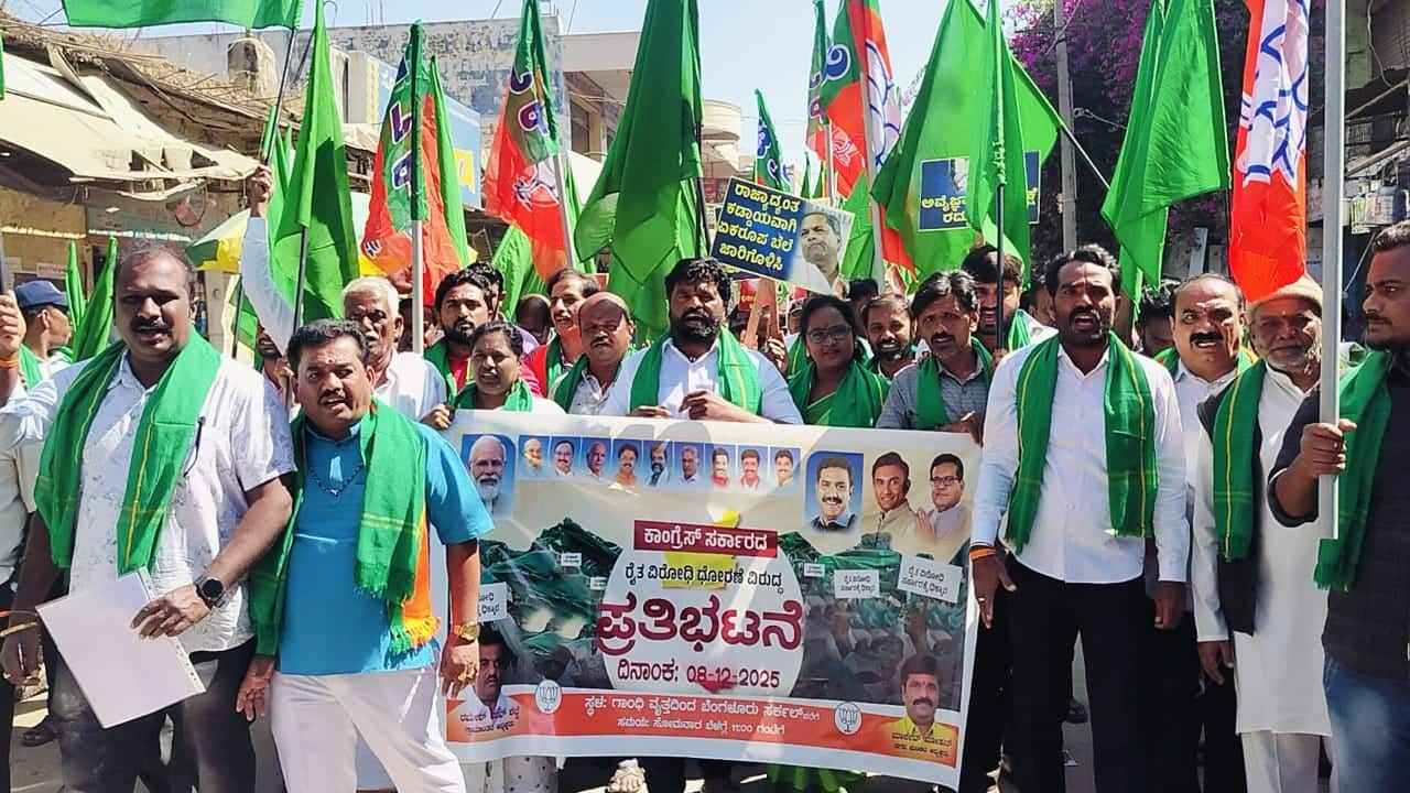 ತಾಲ್ಲೂಕು ಗ್ರಾಮಾಂತರ ಮಂಡಲದ ಅಧ್ಯಕ್ಷ ರಮೇಶ್ ರಾವ್ ಶೆಲ್ಕೆ ಮಾತನಾಡಿ ಬಿಜೆಪಿ ಅವಧಿಯಲ್ಲಿ ರೈತರ ಶ್ರೇಯೋಭಿವೃದ್ಧಿಗೆ ಜಾರಿಗೆ ತರಲಾಗಿದ್ದ ರೈತ ವಿದ್ಯಾನಿಧಿ, ಕಿಸಾನ್ ಸಮ್ಮಾನ ಯೋಜನೆ, ಡೀಸೆಲ್ ಸಬ್ಸಿಡಿ ಸೇರಿದಂತೆ ಎಲ್ಲ ಯೋಜನೆಗಳಿಗೆ ಕಾಂಗ್ರೆಸ್ ಸರ್ಕಾರ ಬ್ರೇಕ್ ಹಾಕಿದೆ. ಇದರೊಟ್ಟಿಗೆ ತುಂತುರು ನೀರಾವರಿ ಪರಿಕರ ದರ ಹೆಚ್ಚಳ, ಟಿಸಿ ದುಬಾರಿ, ಸ್ಟ್ಯಾಂಪ್ ಬೆಲೆ ಹೆಚ್ಚಳ ಮಾಡಿ ರೈತರ ಬದುಕನ್ನು ದುಸ್ತರವಾಗಿಸಿದೆ ಎಂದರು.ಈ ಸಂದರ್ಭದಲ್ಲಿ ಜಿಲ್ಲಾ ಪ್ರಧಾನಕಾರ್ಯದರ್ಶಿ ಮುರುಳಿಧರ್, ಪ್ರಧಾನಕಾರ್ಯದರ್ಶಿಗಳಾದ ಕೊಡಿಲಪ್ಪ, ಹರೀಶ್ ವೇಣುಮಾದವ್, ನಗರ ಶಕ್ತಿಕೇಂದ್ರ ಅಧ್ಯಕ್ಷರಾದ ದಾಲ್ ರಮೇಶ್, ಬಂಡಪಲ್ಲಿಮೂರ್ತಿ ನಕ್ಕಲಹಳ್ಳಿ ಮಾಜಿಅಧ್ಯಕ್ಷರಾದ ರಾಜು, ಹಿರಿಯ ಕಾರ್ಯಕರ್ತರದ ಮುದ್ದುವೀರಪ್ಪ, ರಾಮಕೃಷ್ಣರೆಡ್ಡಿ,ಅಶ್ವತ್ಥರೆಡ್ಡಿ ಬಾದಿಮಳೂರು ಅಶ್ವಥ್ ಉಪಾಧ್ಯಕ್ಷರಾದ ರಾಘವೇಂದ್ರ,ಅರುಣಮ್ಮ,ಮಂಜುನಾಥರಾವ್, ಎಸ್.ಟಿ.ಮೊರ್ಚಾ ಅಧ್ಯಕ್ಷರಾದ ಶಾಂತಕುಮಾರ್ ಮಹಿಳಾ ಮೋರ್ಚಾದ ಅಧ್ಯಕ್ಷರಾದ ಪಾರ್ವತಮ್ಮ, ಫ್ಯಾಕ್ಟರಿ ರಮೇಶ್, ಯುವಮೋರ್ಚಾ ಅಧ್ಯಕ್ಷರಾದ ಅಜಯ್ ಮಾರುತಿ ಭರತ್ ಮಣಿಕಂಠ ಸೆಟ್ ಮಧುನಾಗೇಶ್ ದ್ವಾರಕೀಶ್ ಅಪಾರ ಸಂಖ್ಯೆಯ ಕಾರ್ಯಕರ್ತರು ಭಾಗವಹಿಸಿದ್ದರು.