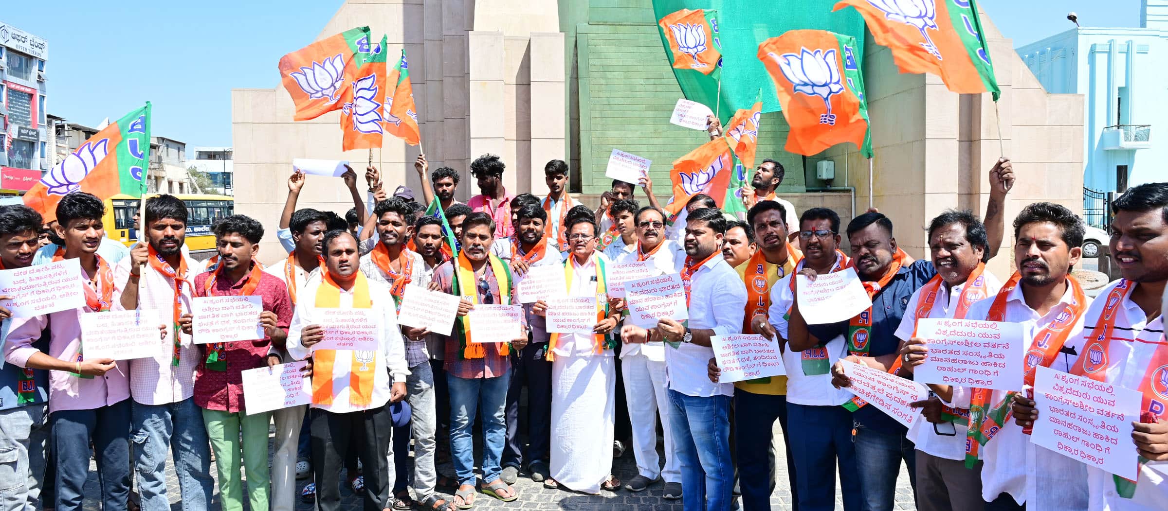 ನಡೆಸಿದ ಕ್ರಮವನ್ನು ಖಂಡಿಸಿ ಬಿಜೆಪಿ ಯುವ ಮೋರ್ಚಾ ಕಾರ್ಯಕರ್ತರು ನಗರದಲ್ಲಿ ಪ್ರತಿಭಟನೆ ನಡೆಸಿದರು.ಪ್ರಧಾನಮಂತ್ರಿ ನರೇಂದ್ರ ಮೋದಿ ಅವರನ್ನು ಗುರಿಯಾಗಿಸಿಕೊಂಡು ದೇಶಕ್ಕೆ ಕಳಂಕ ಉಂಟುಮಾಡುವ ಚಾಳಿಯನ್ನು ಕಾಂಗ್ರೆಸ್ ಮುಂದುವರಿಸಿದೆ. ಕಾಂಗ್ರೆಸ್ ನಾಯಕ ರಾಹುಲ್ ಗಾಂಧಿ ಅವರ ಸಲಹೆಯಂತೆಯೇ ಕಾಂಗ್ರೆಸ್ ಕಾರ್ಯಕರ್ತರು ಶೃಂಗಸಭೆ ವೇಳೆ ನಾಚಿಕೆ ಬಿಟ್ಟು ಅರೆಬೆತ್ತಲೆ ಪ್ರತಿಭಟನೆ ನಡೆಸಿ, ದೇಶಕ್ಕೆ ಅವಮಾನ ಮಾಡಿದ್ದಾರೆ ಎಂದು ಪ್ರತಿಭಟನಾಕಾರರು ದೂರಿದರು.ದೆಹಲಿಯಲ್ಲಿ ಹಮ್ಮಿಕೊಳ್ಳಲಾಗಿದ್ದ ಎಕ್ಸ್ಪೋ ಶೃಂಗಸಭೆಯಲ್ಲಿ ಏಕಾಏಕಿ ಪ್ರವೇಶ ಮಾಡಿದ ಕಾಂಗ್ರೆಸ್ ಕಾರ್ಯಕರ್ತರು, ಶರ್ಟ್ ಬಿಚ್ಚಿ ಪ್ರತಿಭಟಿಸಿದ್ದಾರೆ. ಪ್ರಧಾನಮಂತ್ರಿ ನರೇಂದ್ರ ಮೋದಿ ಹಾಗೂ ಅಮೆರಿಕ ಅಧ್ಯಕ್ಷ ಡೊನಾಲ್ಡ್ ಟ್ರಂಪ್ ಅವರ ಚಿತ್ರಗಳಿರುವ ಟಿ-ಶರ್ಟ್ ಗಳನ್ನು ಪ್ರದರ್ಶಿಸಿ, ಭಾರತ-ಅಮೆರಿಕ ಒಪ್ಪಂದದ ನೆಪದಲ್ಲಿ ಪ್ರಧಾನಮಂತ್ರಿ ದೇಶದ ಹಿತ ಕಾಯುವ ಬದಲು ಟ್ರಂಪ್ ಜೊತೆ ರಾಜಿ ಮಾಡಿಕೊಂಡಿದ್ದಾರೆ ಎಂದು ಘೋಷಣೆಗಳನ್ನು ಕೂಗಿದ್ದಾರೆ. ಅಂತರಾಷ್ಟ್ರೀಯ ವೇದಿಕೆಯಲ್ಲಿ ಭಾರತದ ಪ್ರತಿಷ್ಠೆಯನ್ನು ಹಾಳು ಮಾಡುವ ಹುನ್ನಾರದಿಂದ ಕಾಂಗ್ರೆಸ್ಸಿಗರು ಈ ಕೃತ್ಯ ಎಸಗಿದ್ದು, ದೇಶವನ್ನು ಅವಮಾನಕ್ಕೀಡು ಮಾಡಿದ್ದಾರೆ. ಕಾಂಗ್ರೆಸ್ ನ ರಾಷ್ಟ್ರೀಯ ನಾಯಕರು ಕೂಡಲೇ ಕ್ಷಮೆಯಾಚಿಸಬೇಕು ಎಂದು ಆಗ್ರಹಿಸಿದರು.