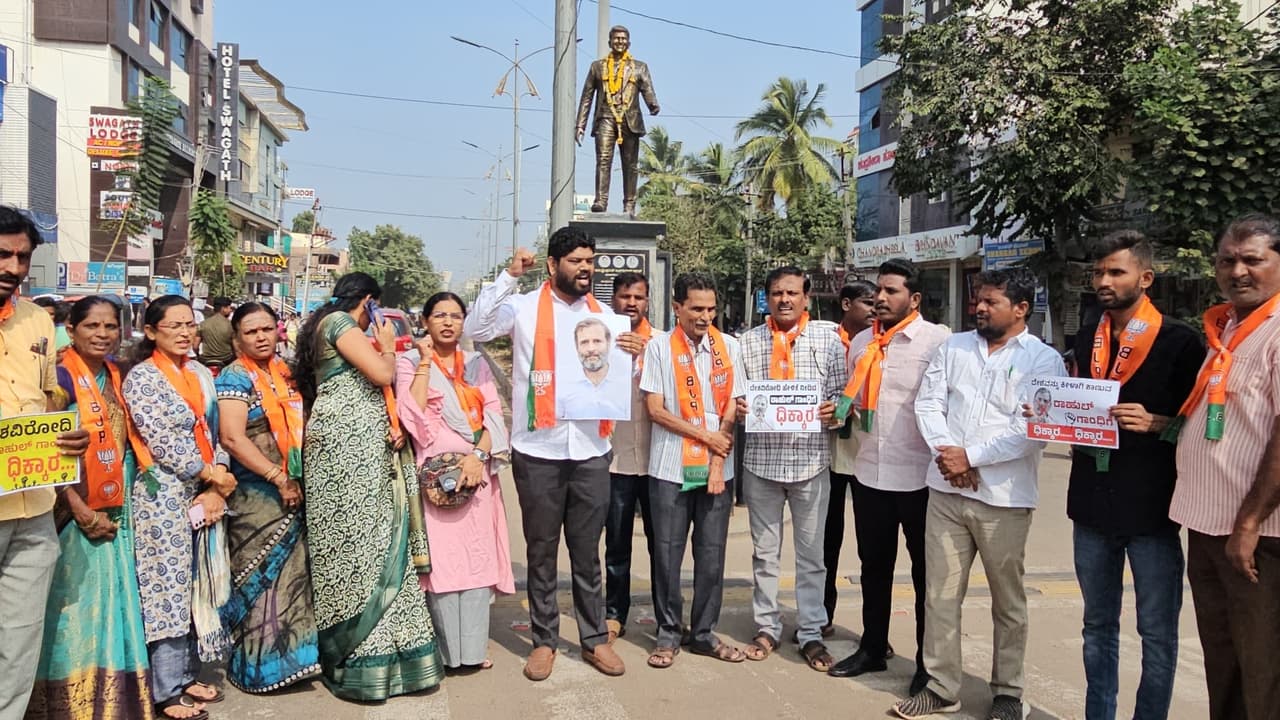 ಹೊಸಪೇಟೆಯಲ್ಲಿ ಬಿಜೆಪಿ ಜಿಲ್ಲಾ ಯುವ ಮೋರ್ಚಾದ ಪದಾಧಿಕಾರಿಗಳು ರಾಹುಲ್ ಗಾಂಧಿ ಅವರ ದೇಶ ವಿರೋಧಿ ಹೇಳಿಕೆಯನ್ನು ಖಂಡಿಸಿ ಶುಕ್ರವಾರ ಪುನೀತ್ ವೃತ್ತದಲ್ಲಿ ಪ್ರತಿಭಟನೆ ನಡೆಸಿದರು.