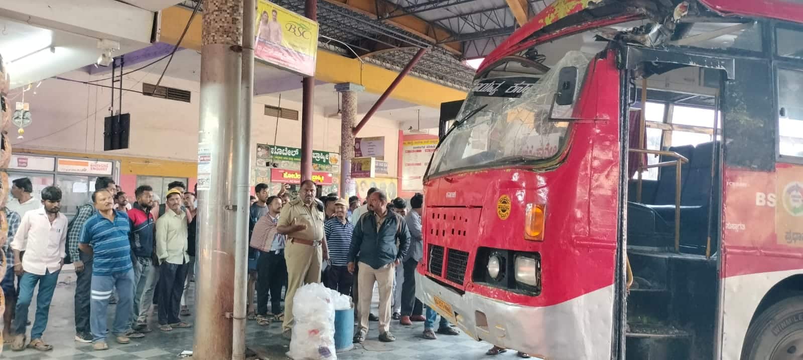 ಲಕ್ಷ್ಮೇಶ್ವರಕ್ಕೆ ತೆರಳುತ್ತಿದ್ದ ಬಸ್ ಅತಿ ವೇಗದಲ್ಲಿ ಬಸ್ ನಿಲ್ದಾಣಕ್ಕೆ ಬಂದಿದ್ದಲ್ಲದೇ, ಪ್ರಯಾಣಿಕರು ಕಾಯುವಿಕೆಗೆ ನಿರ್ಮಿಸಿದ ಕಾರಿಡಾರ್ಗೆ ನುಗ್ಗಿ ಮುಂದೆ ಇದ್ದ ಬೇಕರಿ ಕಟ್ಟಡಕ್ಕೆ ಡಿಕ್ಕಿ ಹೊಡೆದು ನಿಂತಿದೆ. ಇದರ ರಭಸಕ್ಕೆ ಬಸ್ಗಾಗಿ ಕಾಯುತ್ತಿದ್ದವರು ಬಸ್ನ ಅಡಿಯಲ್ಲಿ ಸಿಲುಕಿ ಅವಘಡ ಸಂಭವಿಸಿದೆ. ಈ ದೃಶ್ಯ ಕಂಡು ಅಲ್ಲಿದ್ದ ನೂರಾರು ಪ್ರಯಾಣಿಕರು ಕಂಗಾಲಾದರು.ಸ್ಥಳದಲ್ಲಿ ನೂರಾರು ಜನರ ಸೇರಿಕೊಂಡು ಬಸ್ ಚಾಲಕನ ನಿರ್ಲಕ್ಷ್ಯಕ್ಕೆ ಛೀಮಾರಿ ಹಾಕಿ, ಆಕ್ರೋಶ ವ್ಯಕ್ತಪಡಿಸಿದರು. ಘಟನಾ ಸ್ಥಳಕ್ಕೆ ಪೊಲೀಸರ ಭೇಟಿ ನೀಡಿ ಪರಿಶೀಲನೆ ನಡೆಸಿದ್ದು, ಹಾವೇರಿ ಸಂಚಾರ ಪೊಲೀಸ್ ಠಾಣೆಯಲ್ಲಿ ಪ್ರಕರಣ ದಾಖಲಾಗಿದೆ.