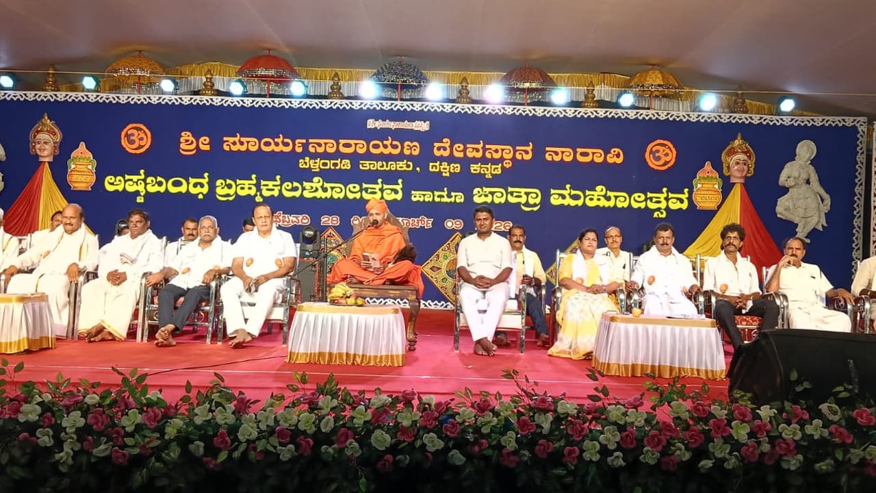 ಅವರು ನಾರಾವಿ ಶ್ರೀ ಸೂರ್ಯನಾರಾಯಣ ದೇವರ ಬ್ರಹ್ಮಕಲಶೋತ್ಸವದ ಮೂರನೇ ದಿನವಾದ ಮಂಗಳವಾರ ನಡೆದ ಧಾರ್ಮಿಕ ಸಭೆಯಲ್ಲಿ ಆಶೀರ್ವದಿಸಿದರು.ಸೂರ್ಯದೇವ ನಮ್ಮೆಲ್ಲರ ಆರೋಗ್ಯ ಕಾಂತಿಗೆ, ಕೀರ್ತಿಗೆ ಕಾರಣ. ನಮ್ಮ ಸಮಾಜದ 16 ಸಮುದಾಯಗಳಿಗೆ ಸೇವೆ ಮಾಡಲು ಅವಕಾಶವಿರುವುದು ಜಾತ್ರೆಯಂತಹ ಧಾರ್ಮಿಕ ಕಾರ್ಯಕ್ರಮಗಳಲ್ಲಿ ಮಾತ್ರ. ಶಾಲೆಗಳು ಇರದ ಕಾಲದಲ್ಲಿ ದೇವಸ್ಥಾನಗಳು ಸಂಸ್ಕಾರ ಕೇಂದ್ರಗಳಾಗಿದ್ದವು ಎಂದರು.