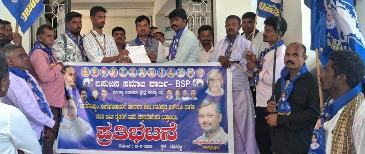 ಬಿಎಸ್ಪಿ ರಾಜ್ಯಾಧ್ಯಕ್ಷ ಎಂ.ಕೃಷ್ಣಮೂರ್ತಿ ಮಾತನಾಡಿ, ಭೂಗಳ್ಳರಿಗೆ ಸುಲಭವಾಗಿ ಖಾತೆ ಮಾಡಿಕೊಡುವ ಅಧಿಕಾರಿಗಳು ಲಂಚ ಕೊಡದ ರೈತರಿಗೆ ಸಮರ್ಪಕ ಕೆಲಸ ನಿರ್ವಹಿಸುತ್ತಿಲ್ಲ. ಧನಗೂರು ಬಳಿ ನಿಜವಾಗಲೂ ಉಳಿಮೆ ಮಾಡುತ್ತಿದ್ದ ರೈತರ ಜಮೀನನ್ನು ತೆರವು ಮಾಡಿ ಅನ್ಯಾಯ ಮಾಡುತ್ತಿದ್ದಾರೆ ಎಂದು ದೂರಿದರು.ಶಾಸಕರೇ ಬಗರ್ ಹುಕ್ಕುಂ ಸಮಿತಿಯ ಅಧ್ಯಕ್ಷರಾಗಿರುವುದರಿಂದ ನೈಜ ರೈತರಿಗೆ ಭೂಮಿ ಮಂಜೂರು ಮಾಡಬೇಕು. ಅವರಿಗೆ ಸಿಗಬೇಕಾದ ಸವಲತ್ತುಗಳನ್ನು ಕೊಡಿಸಬೇಕೆಂದು ಆಗ್ರಹಿಸಿದರು.